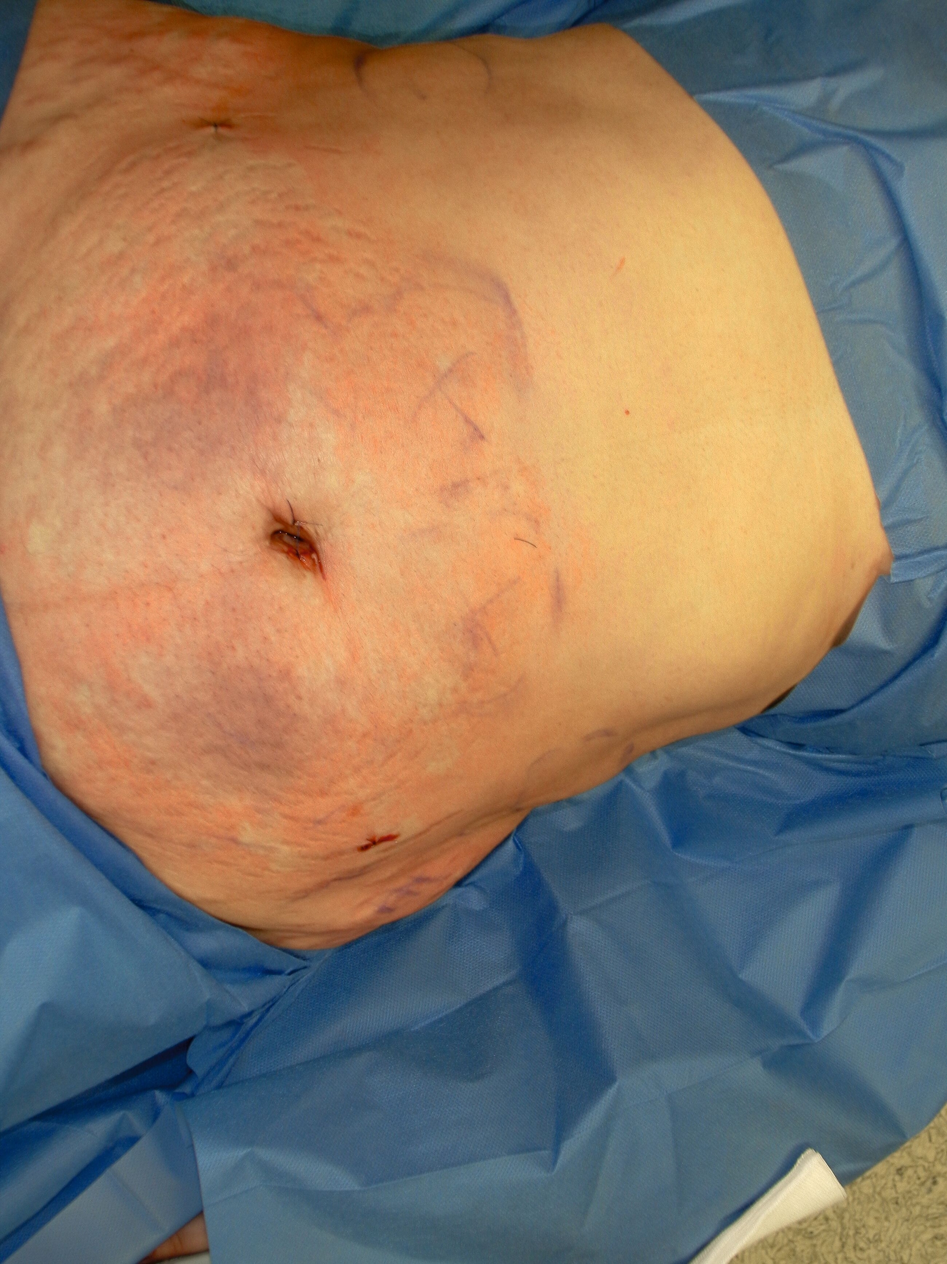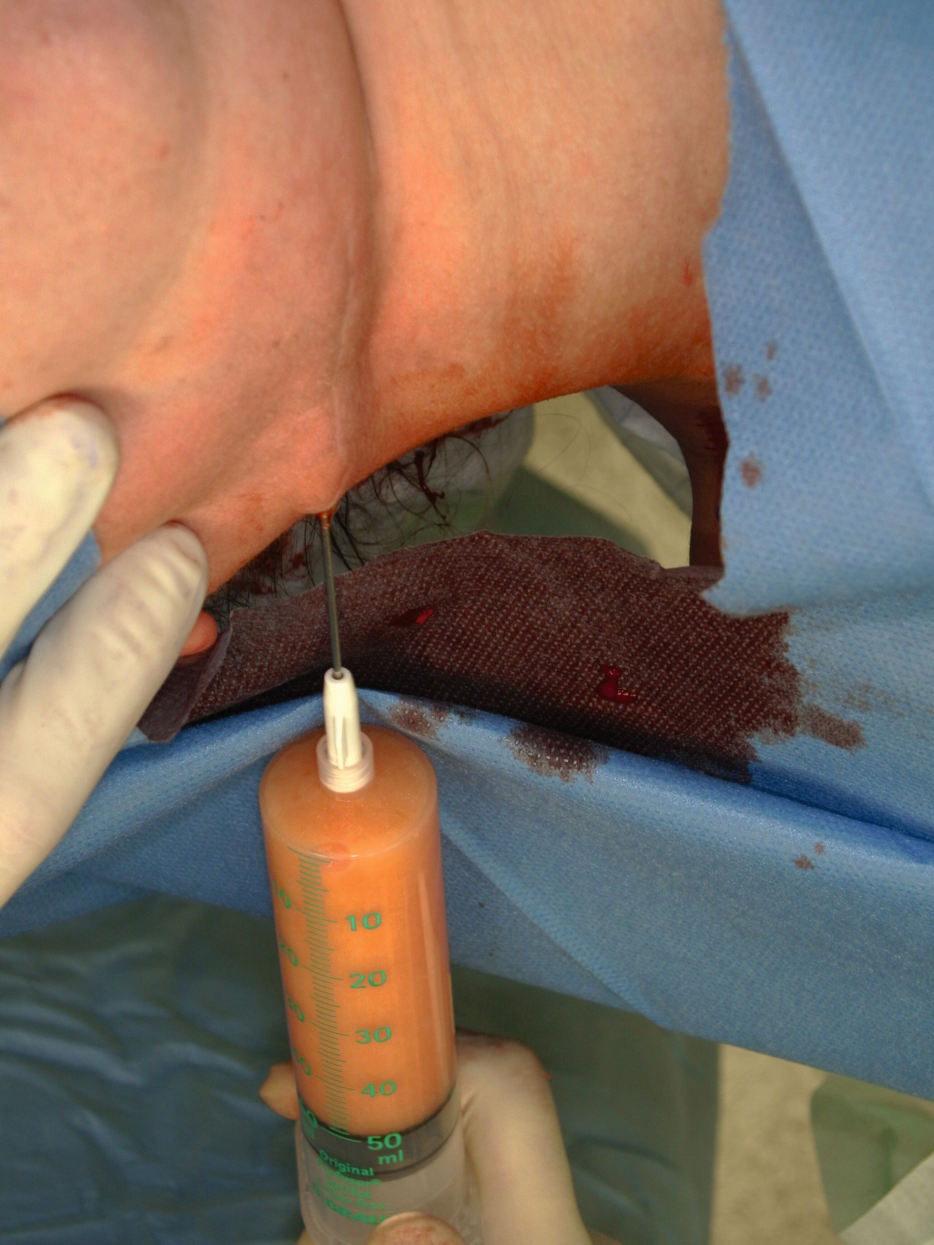 Nach Abheilen der Operationswunden und bei stabilen Wundverhältnissen ohne Hinweise auf ein Fistelrezidiv (Abbildung 1) wurde die Patientin bei bestehendem Rekonstruktionswunsch ausführlich und individuell über verschiedene Möglichkeiten und Alternativen der Defektrekonstruktion sowie deren individuelle Vorteile, Limitationen und Risiken aufgeklärt. Es erfolgte die Entscheidung zu einem erneuten Versuch einer Defektrekonstruktion mittels autologem Fettgewebe durch Liposuktion. Der Eingriff wurde in Allgemeinanästhesie durchgeführt. Hierbei erfolgte die Entnahme von 400 ml autologem Fettgewebe mittels abdomineller Liposuktion (Abbildungen 3, 4), welches zu Teilen (circa 30 ml) in die submandibuläre Defektregion appliziert wurde (Abbildungen 5, 6).