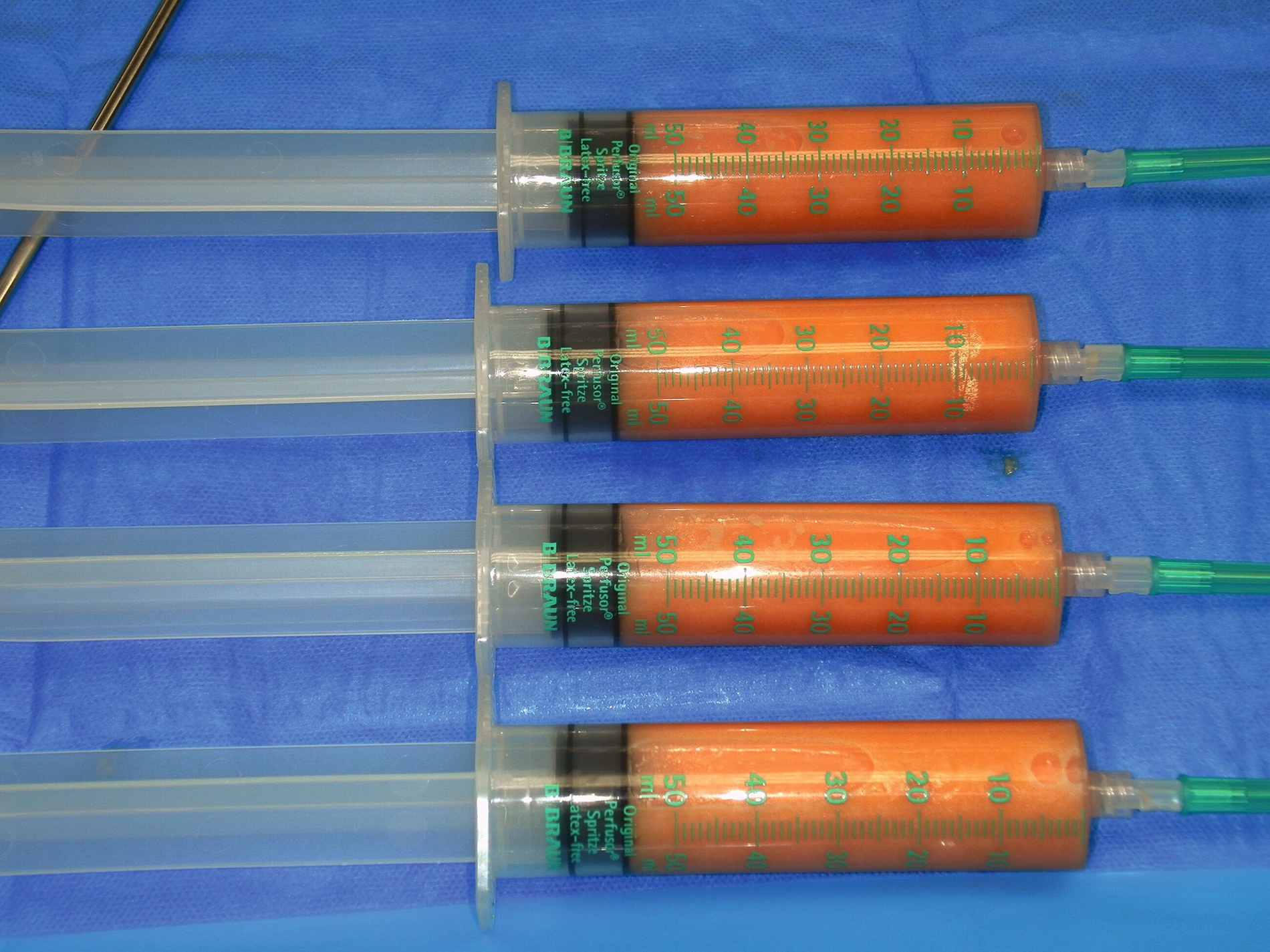 Bei der in diesem Fall angewendeten sogenannten Wasserstrahl-assistierten Liposuktion handelt es sich um ein neueres, sehr schonendes Verfahren zur Gewinnung von Fettgewebe. Hierbei wird eine Wasserstrahltechnik verwendet, mit der die Lösung und anschließende Absaugung der Adipozyten unter Verwendung einer, gegenüber herkömmlichen Verfahren, deutlich geringeren Menge an Tumneszenzlösung möglich ist. Ebendiese besteht in Abhängigkeit von der Anästhesie aus einer Mischung von lang- und kurzwirksamen Lokalanästhetika, Adrenalin zum Zweck der lokalen Blutstillung und Natrium-Bikarbonat zur Pufferung in isotoner Kochsalzlösung. Die Verwendung einer geringeren Menge Tumneszenzlösung erlaubt die Reduktion der postoperativen Schwellung und eine zügigere Heilung des chirurgisch gesetzten Traumas. Neben der Reduktion der Flüssigkeitsmenge bedingt die schonende Lösung der Zellen außerdem eine reduzierte Traumatisierung des Gewebes, was mit einer geringeren Hämatombildung und weniger Schmerzen einhergeht.