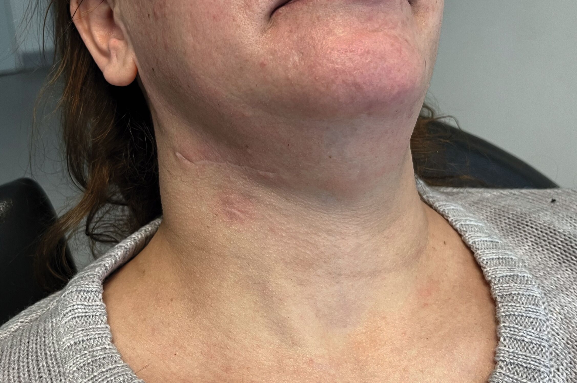 Eine Patientin stellte sich aufgrund eines seit etwa einem Jahr bestehenden ausgedehnten submandibulären Volumendefekts rechts in Folge einer alio loco durchgeführten Submandibulektomie in einer Klinik für Hals-Nasen-Ohrenheilkunde und einer postoperativen Wundheilungsstörung und Infektion vor. Nach Abheilen der Akutsituation erfolgte alio loco bereits der Versuch einer Defektrekonstruktion mit autologem Fettgewebe aus dem Bereich einer Sectionarbe des Unterleibs. Auch dabei kam es zu einer postoperativen Wundheilungsstörung und zu einer Infektion des transplantierten Fettgewebes, so dass das Transplantat vollständig verloren ging und sich die Defektsituation weiter verschlechterte. Die Patientin stellte sich mit einem starken Wunsch nach einer plastisch-ästhetischen Rekonstruktion des submandibulären Volumendefektes vor, der für die Patientin mittlerweile eine große psychische Belastung darstellte.