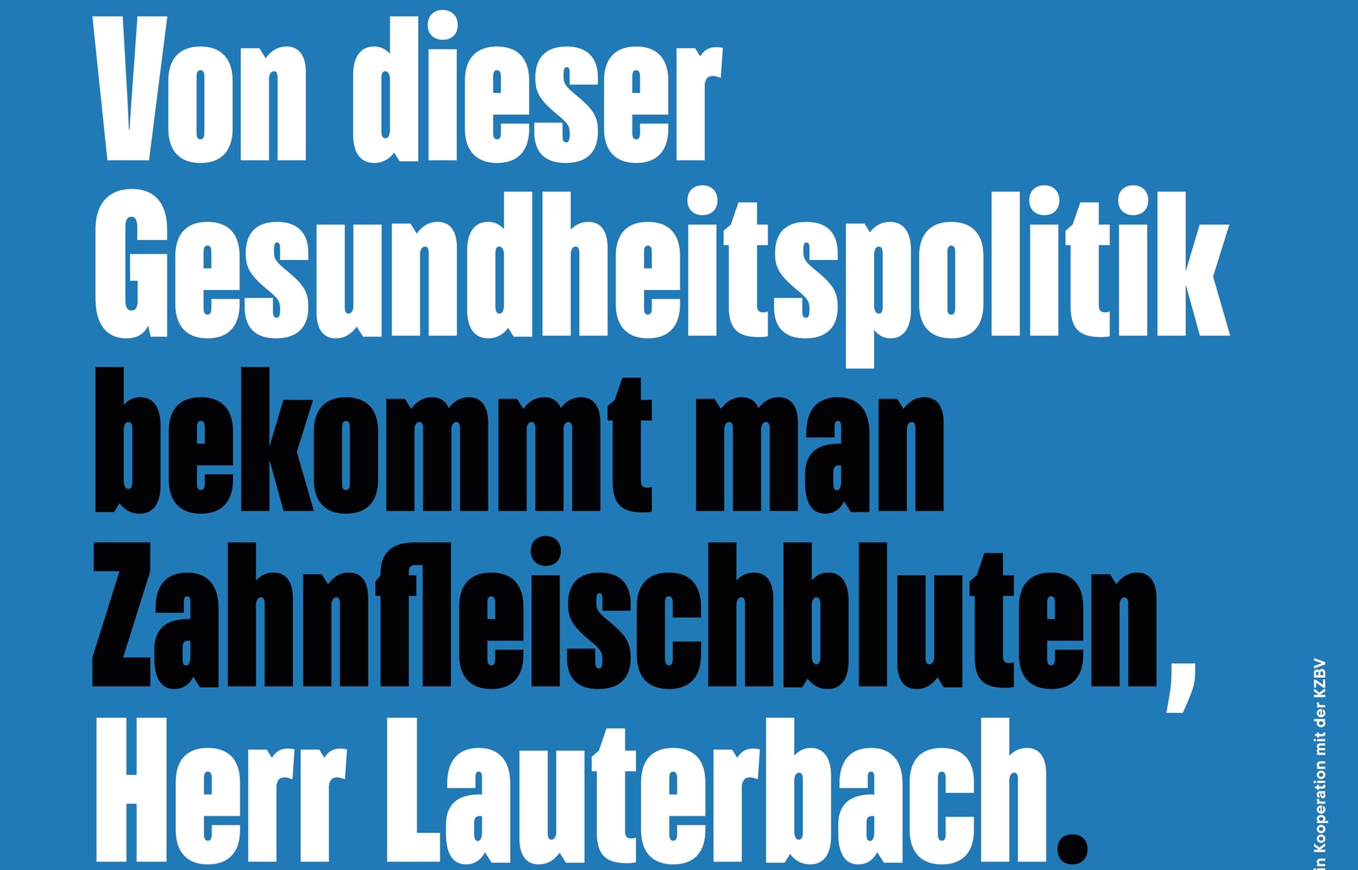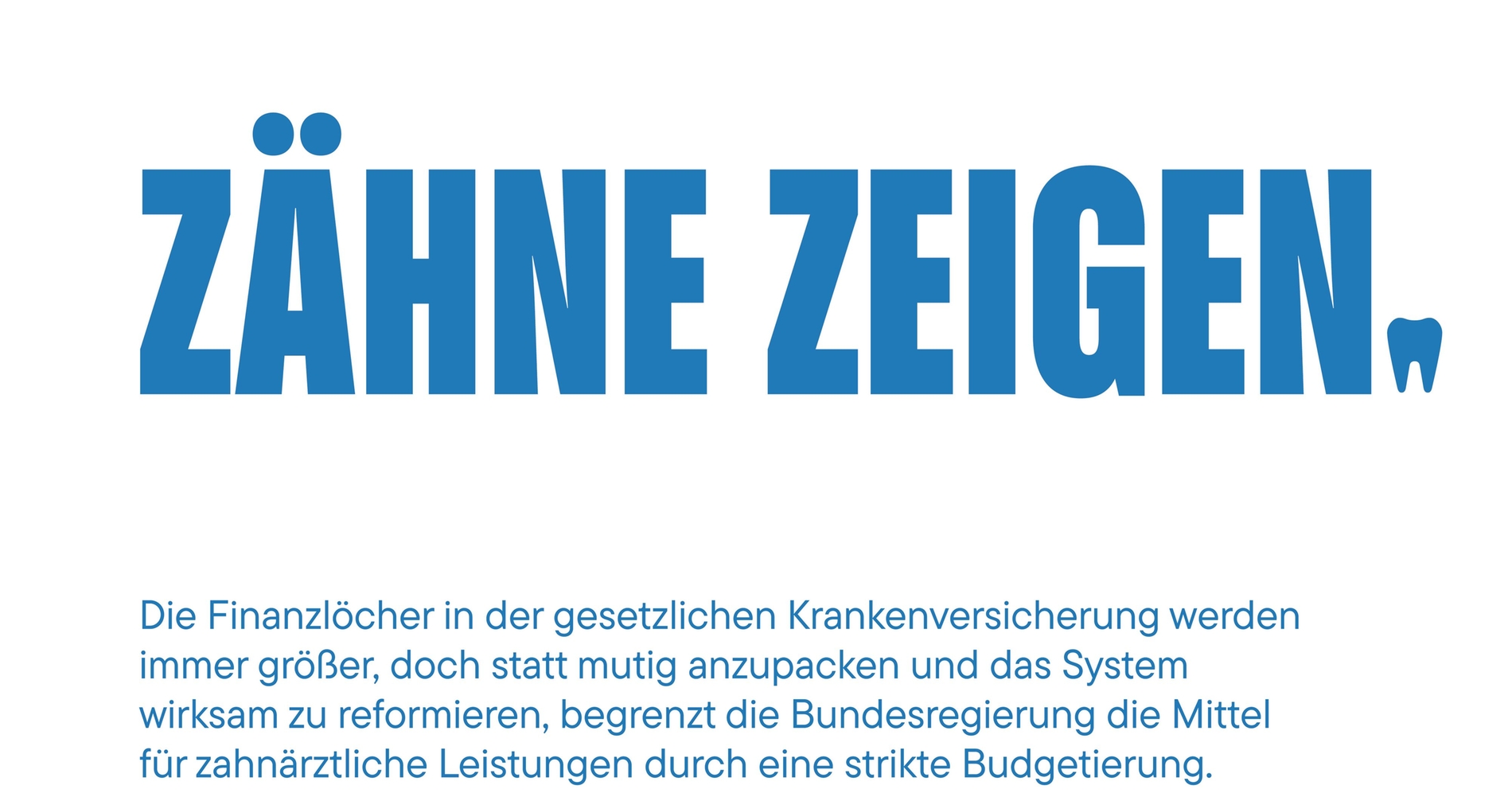 Auf den blau-weißen Plakaten thematisieren konkrete Leitsätze die drohenden regionalen Versorgungsprobleme („Versorgung örtlich betäubt“) und die begrenzten Mittel zur Behandlung der Volkskrankheit Parodontitis („Diagnose Sparodontose“ oder „Von dieser Gesundheitspolitik bekommt man Zahnfleischbluten, Herr Lauterbach“). Leicht verständliche Statements und Erklärtexte helfen bei der Vermittlung der konkreten negativen Auswirkungen des GKV-Finanzstabilisierungsgesetzes und weiterer sich in der Planung befindlicher Spargesetze. Mittels QR-Codes kann von den Materialien direkt die Kampagnenseite erreicht werden. Zusätzlich soll ein anschauliches Erklärvideo die Zielsetzung und Handhabung der Kampagne im Praxisteam erkären. Flankiert werden diese Maßnahmen von einer Social-Media-Aktion auf Twitter und Instagram, die unter dem Hashtag #zähnezeigen mit Bildern von Gebissen der Nutzer Aufmerksamkeit erzeugen sollen. Die KZVen werden darüber hinaus in ihren Bundesländern umfassend die regionale Presse über die Kampagne informieren. Ziel ist es, insbesondere in den Sommermonaten eine hohe Öffentlichkeitswirksamkeit herzustellen und Druck auf die Politik auf Lokal-, Landes- und Bundesebene auszuüben, um damit die weitere Gesetzgebung zu beeinflussen.