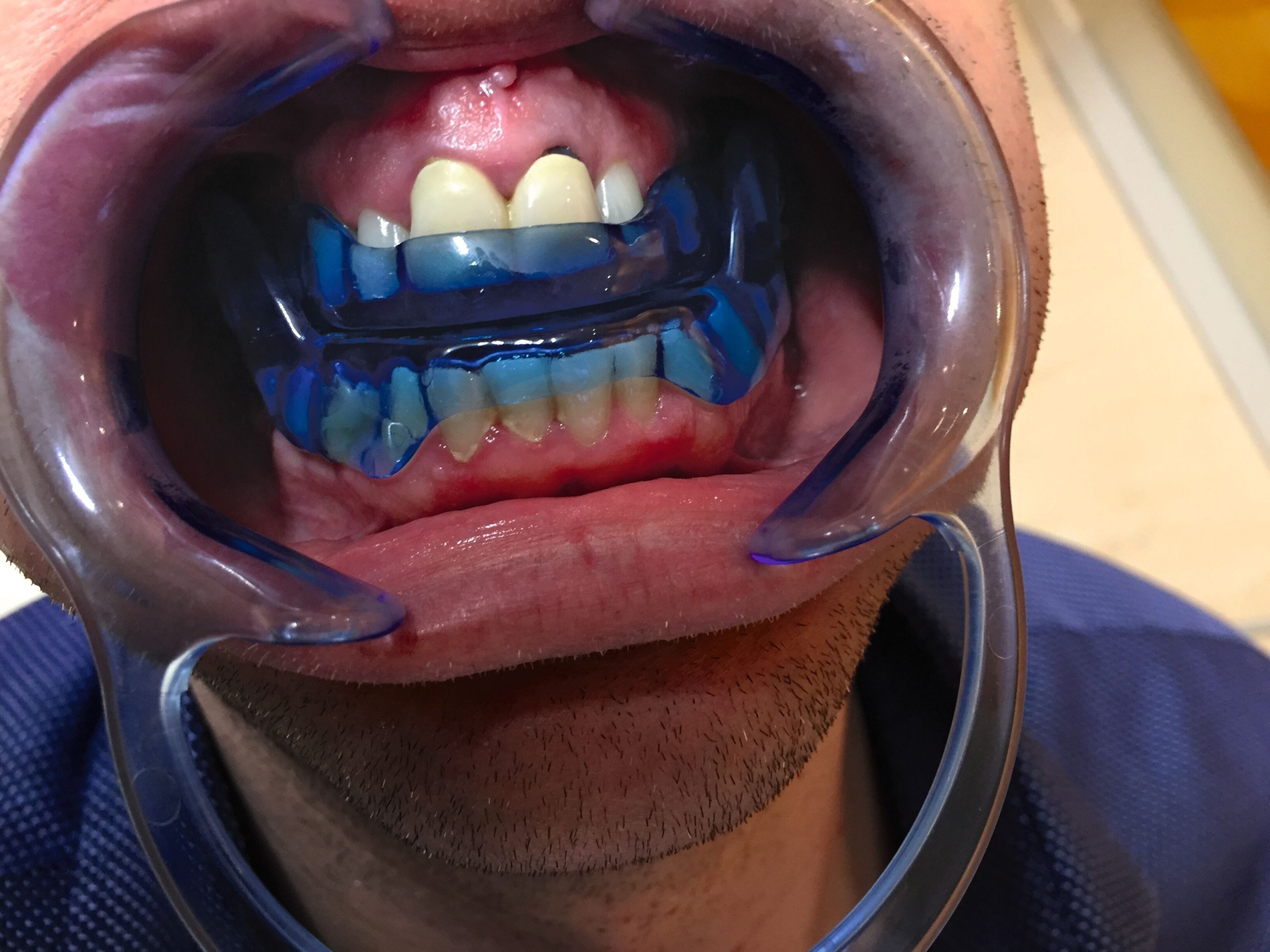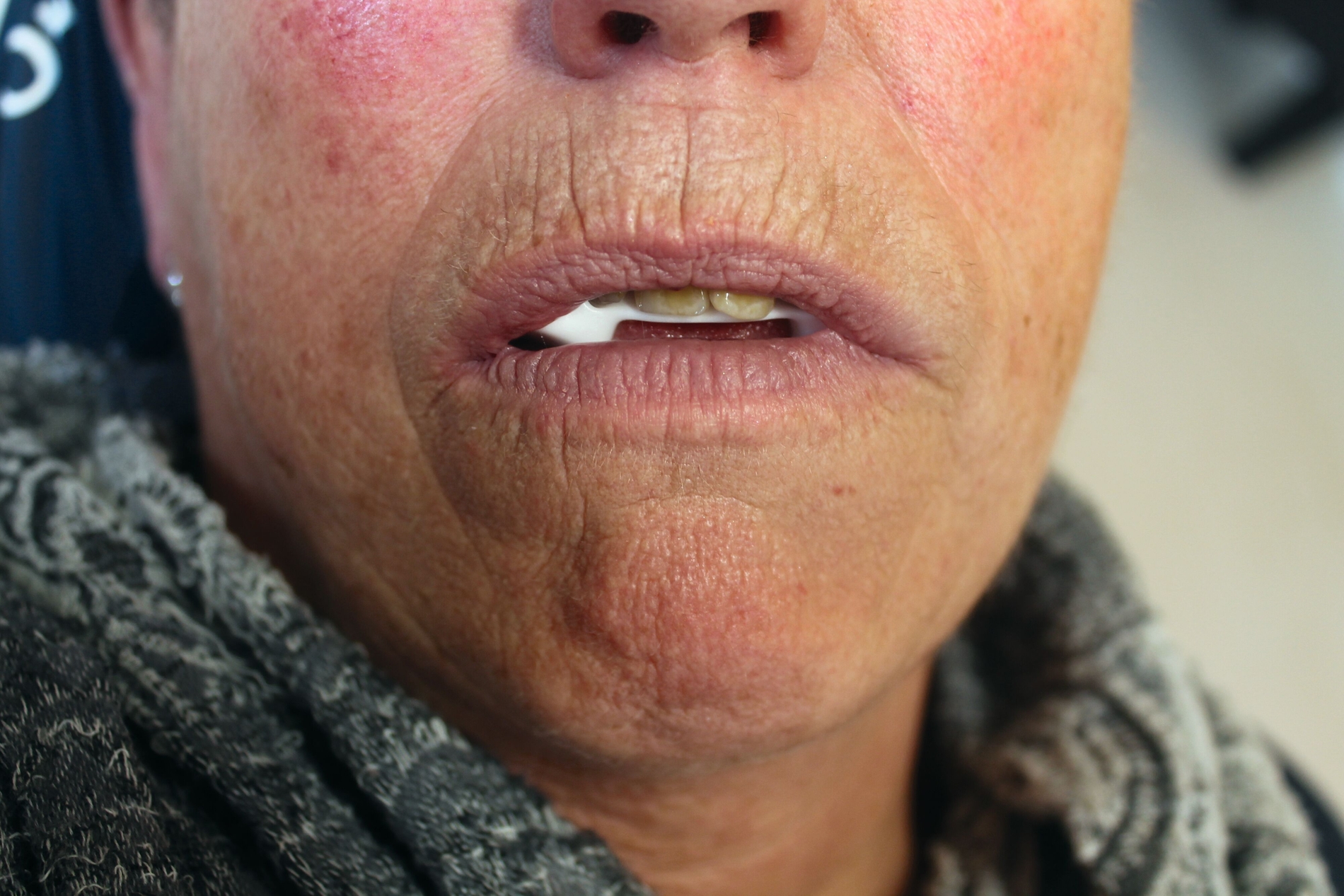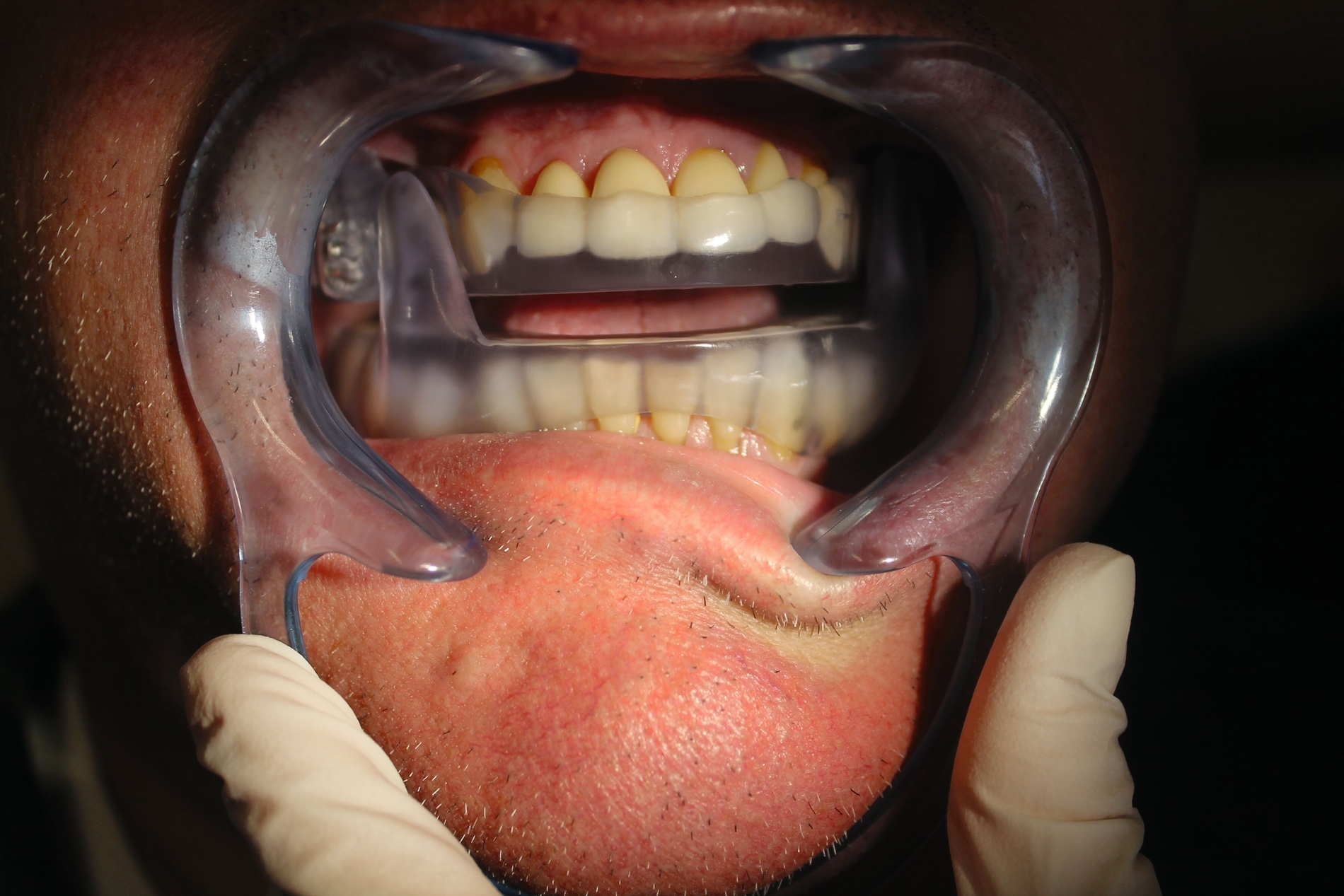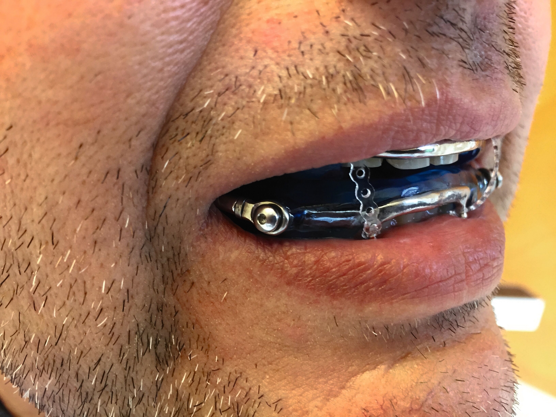Neben den obligatorischen Anforderungen an Biokompatibilität und Retentivität ist ein weiteres entscheidendes Merkmal einer UPS deren Dimensionierung sowie deren Möglichkeit zur Skelettierung, also das Nicht-Bedecken von Zahnabschnitten ohne Stabilitätseinbußen. Labiale Schienenanteile können zum Beispiel die Lippenkompetenz und die physiologische Nasenatmung kompromittieren (Abbildung 1). Abbildung 2 zeigt eine Panthera-Classic®-Schiene, bei der die vestibulären und inzisalen Anteile der Oberkieferfront ausgespart wurden, um den Lippenschluss möglichst nicht zu beeinträchtigen.