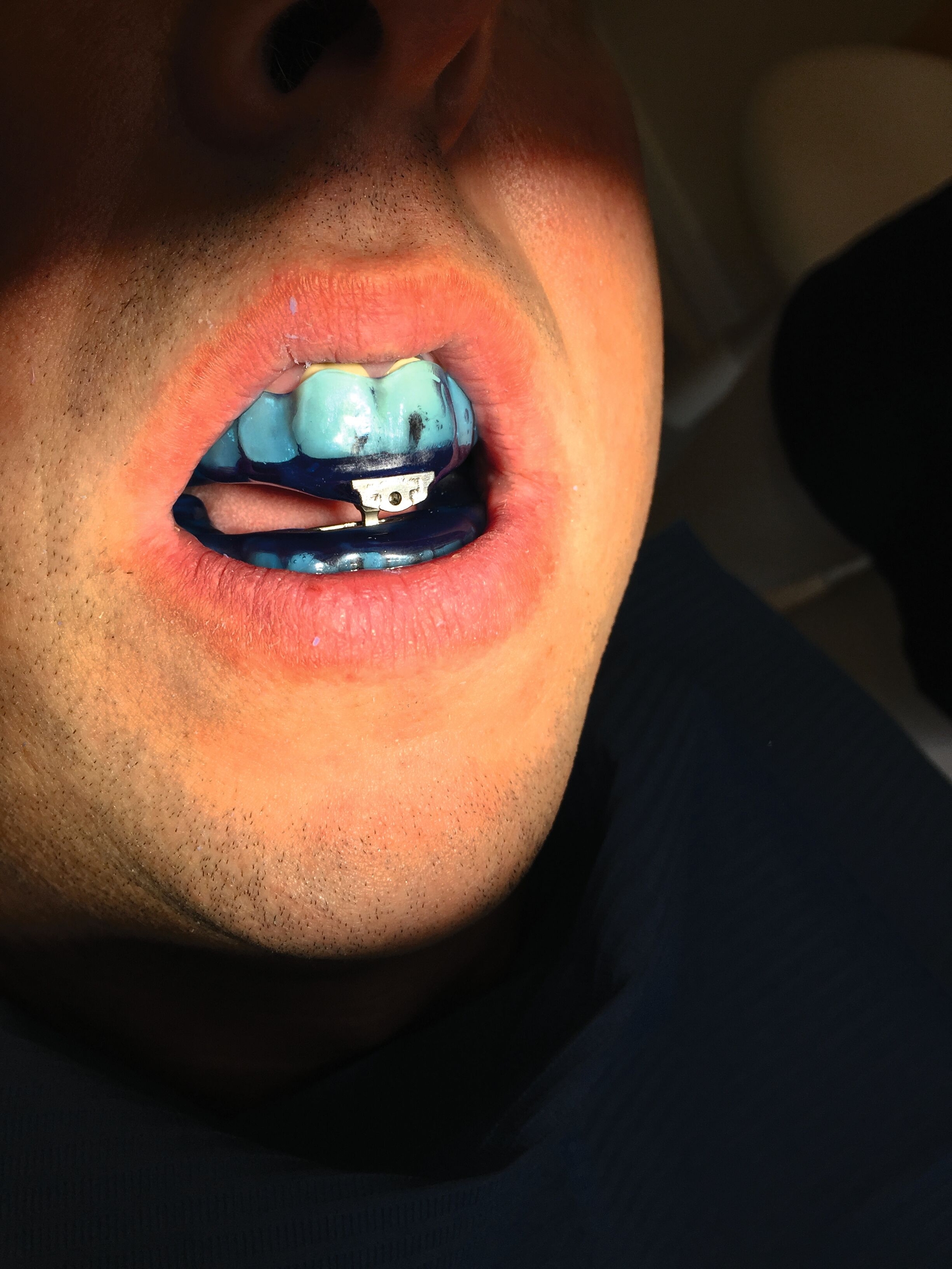 Eine weitere Möglichkeit zur Reduzierung des Schienenvolumens ist die Skelettierung. Schienen wie die H-UPS® oder die Panthera Classic® sind Beispiele für Produkte, die labial und oral im anterioren Bereich auf eine vollständige Zahnbedeckung grundsätzlich oder optional verzichten, um befundabhängig die vertikale Dimension gerade in Tiefbisssituationen gering zu halten und um den Zungenraum und den Lippenschluss nicht durch Schienenanteile zu beeinträchtigen. Die F-UPS pt® kann dabei okklusal punktuell perforiert werden, um die vertikale Dimension in der Therapieposition an intermaxillären Engstellen, zum Beispiel in Fällen mit ausgeprägter Spee-Kurve, auf ein Minimum zu begrenzen (Abbildung 5).