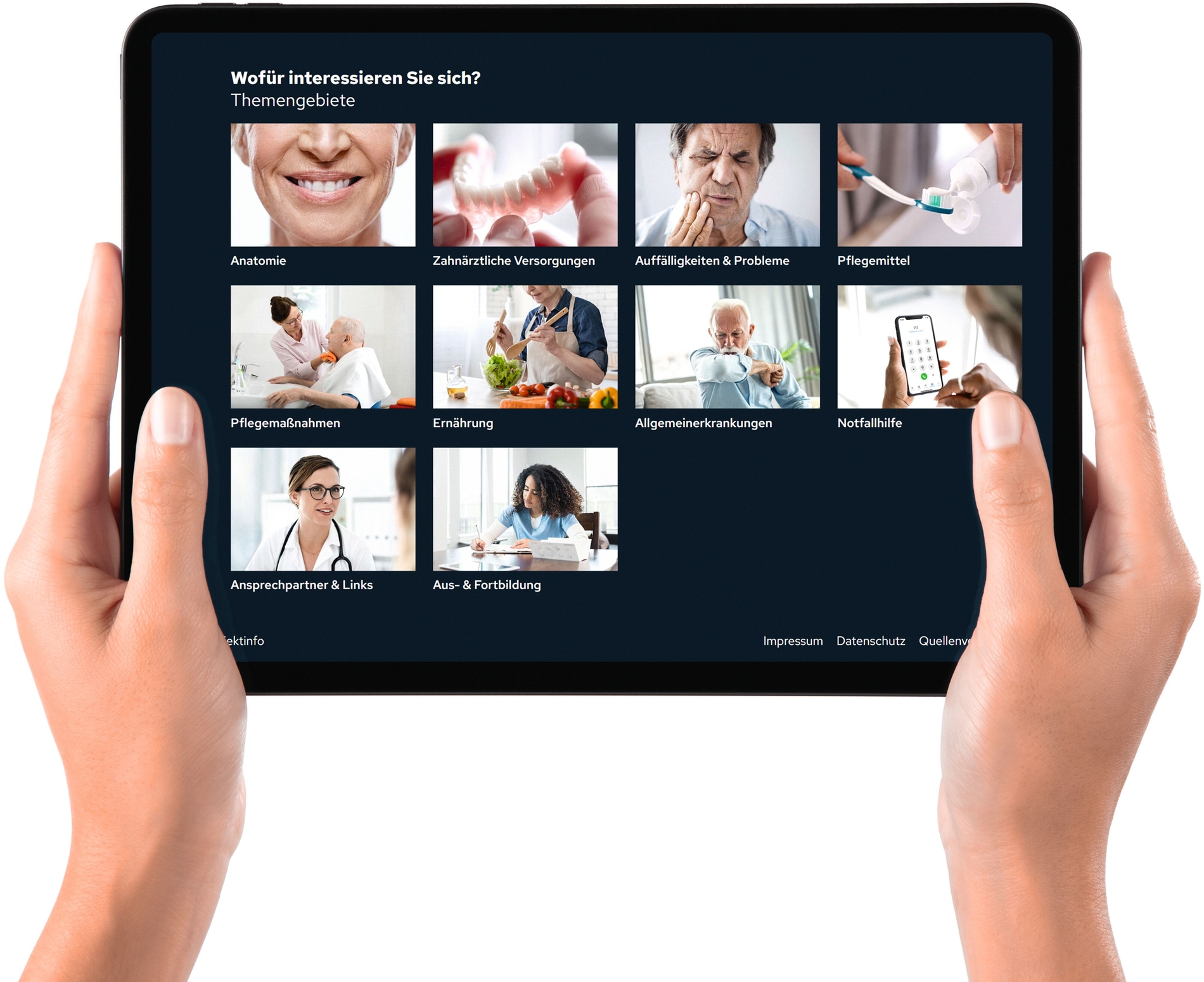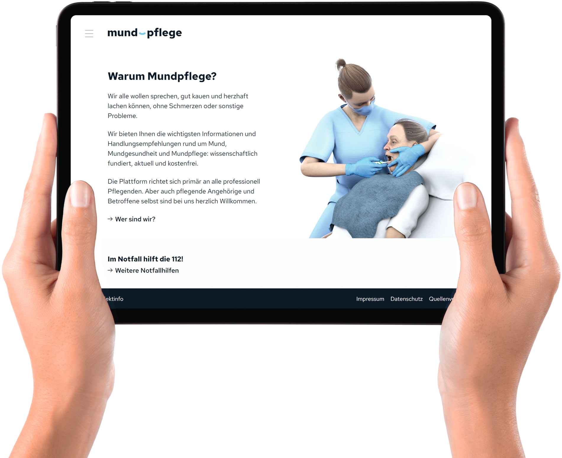 Ratgeber sowie Schulungen für Pflegekräfte und pflegende Angehörige zu Pflegemitteln und deren Anwendung, Hausärzte und in diesem Zusammenhang perspektivisch die verstärkte Nutzung der Videosprechstunde bieten aktuell Möglichkeiten, die Situation zu verbessern. Zudem ist die Implementierungsphase des neuen DNQP-Expertenstandards zur Förderung der Mundgesundheit in der Pflege abgeschlossen. Der Expertenstandard nimmt Pflegefachkräfte in die Verantwortung, Munderkrankungen, Mundhygienedefizite und Risiken für die Mundgesundheit zu erkennen, zu adressieren und entsprechende pflegerische Maßnahmen einzuleiten [Expertenstandard]. Immer mehr Schulungsmaterialien stehen auch digital (24/7) zur Verfügung. So etwa auf der kostenlos verfügbaren Plattform mund-pflege.net (Abbildung 6).