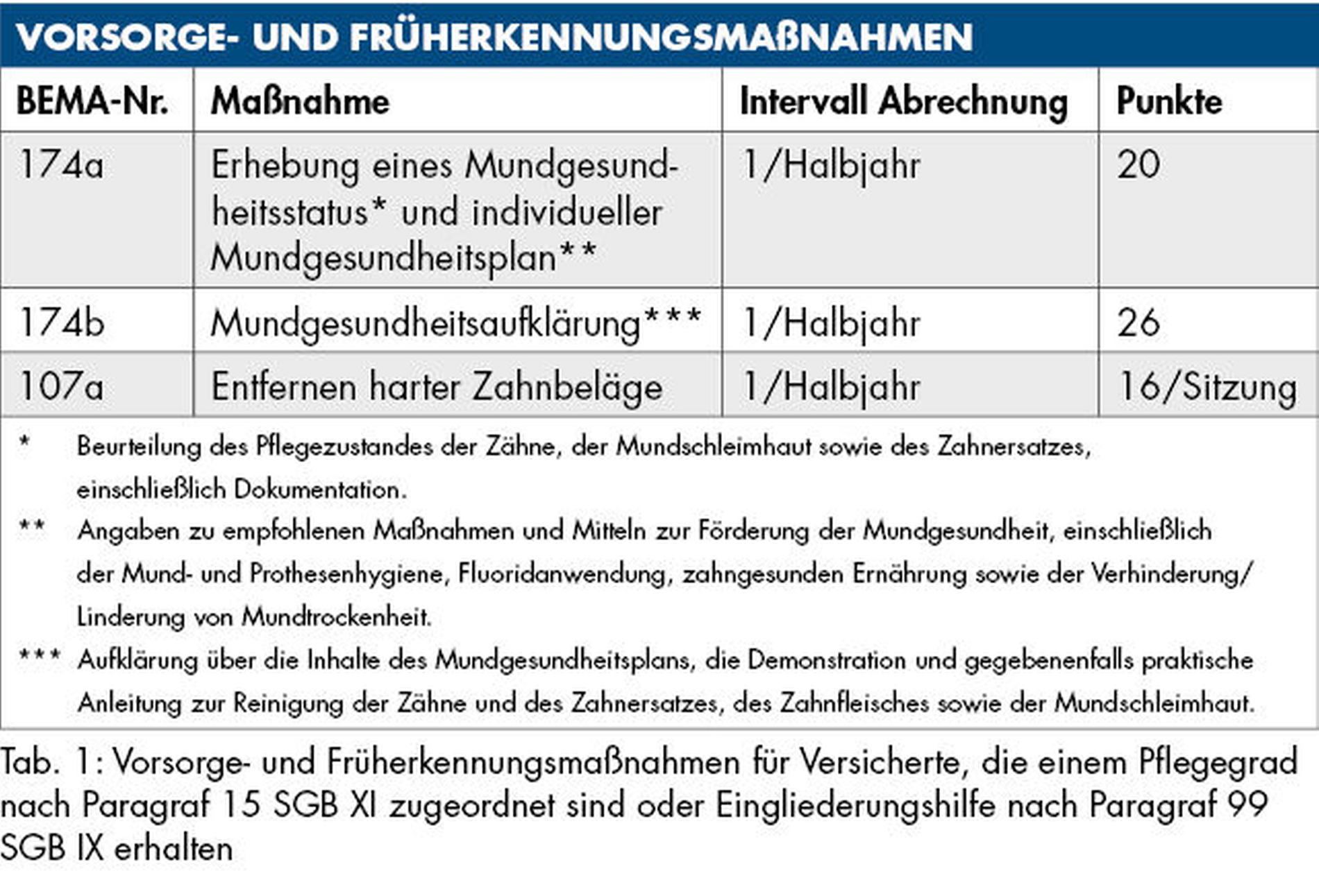Das Fehlen von ATG, MHU, BEV sowie UPT a und b in der verkürzten Strecke im Vergleich zur regulären Strecke soll kompensiert werden durch andere Leistungen gemäß der Richtlinie des Gemeinsamen Bundesausschusses über Maßnahmen zur Verhütung von Zahnerkrankungen bei Pflegebedürftigen und Menschen mit Behinderungen (Richtlinie nach Paragraf 22a SGB V). Patienten, die einem Pflegegrad nach Paragraf 15 SGB XI zugeordnet sind oder Eingliederungshilfe nach Paragraf 99 SGB IX erhalten, haben dieser Richtlinie zufolge unabhängig von einer eventuell bestehenden parodontalen Erkrankung Anspruch auf verschiedene präventionsorientierte Leistungen: Erhebung des Mundgesundheitsstatus (Paragraf 4), Individueller Mundgesundheitsplan (Paragraf 5), Mundgesundheitsaufklärung (Paragraf 6) und Entfernung harter Zahnbeläge (Paragraf 7). Hierbei wurden gemäß der Richtlinie die in Paragraf 22a SGB V ausdrücklich vorgesehenen Leistungen umgesetzt, so dass neben der kurativen Therapie auch präventive Leistungen gestärkt werden (Tabelle 1). Diese Leistungsansprüche gelten übrigens unabhängig davon, ob die Patienten in einer Pflegeeinrichtung, zu Hause oder in der Praxis behandelt werden. Auch in der Praxis ist es daher sinnvoll, den möglichen Pflegegrad älterer Patienten zu erfragen und diese Leistungen bei entsprechender Indikation zu erbringen.