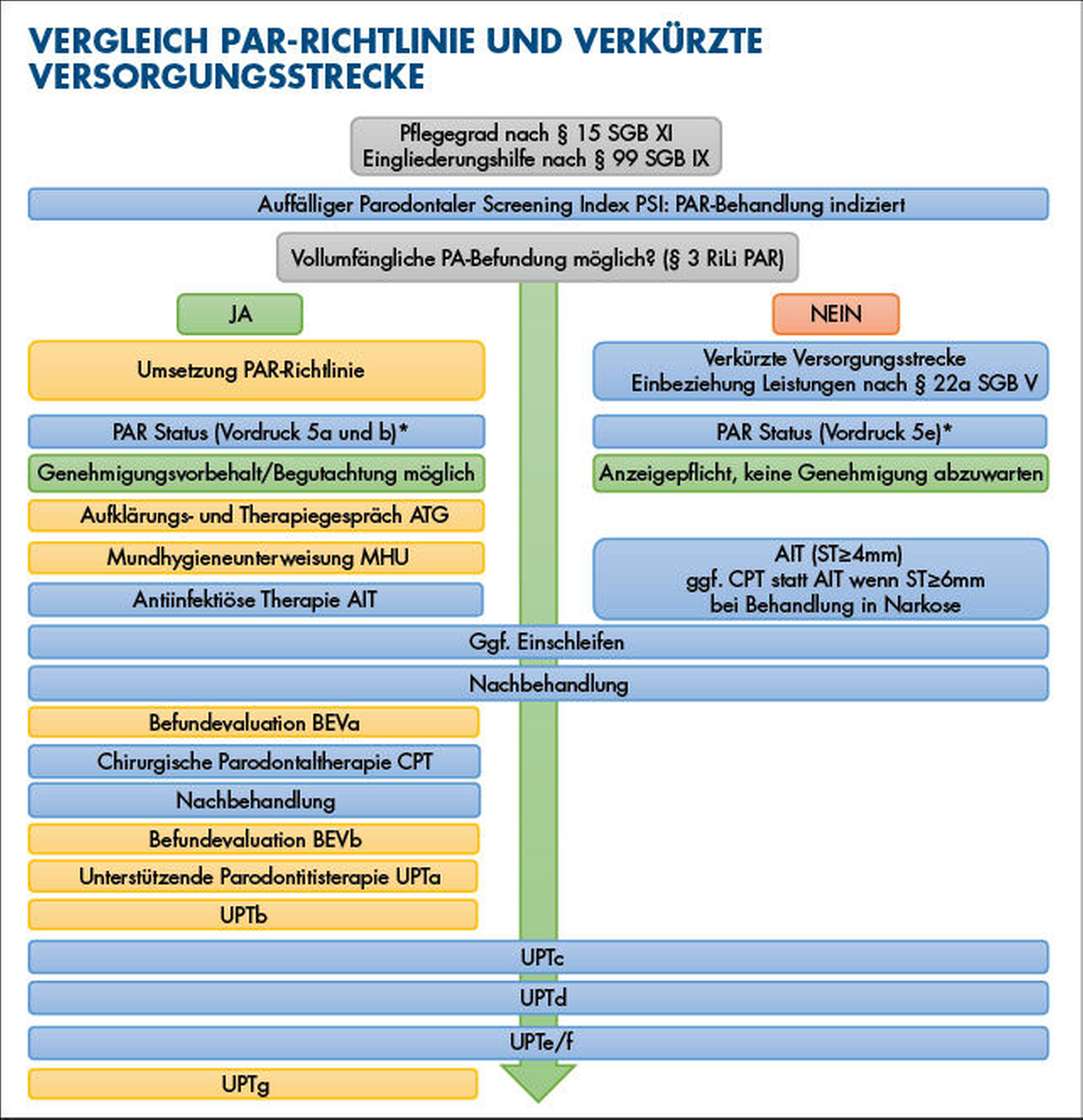 Im Rahmen der vertragszahnärztlichen Versorgung ist der Zugang zur Parodontitistherapie seit Juli 2021 neu geregelt. Die Behandlungsstrecke nach Paragraf 22a richtet sich an Menschen, bei denen die systematische Behandlung gemäß PAR-Richtlinie nicht in vollem Umfang durchgeführt werden kann. Bei Menschen mit zugeordnetem Pflegegrad ist die Fähigkeit zur Aufrechterhaltung der Mundhygiene oder die Kooperationsfähigkeit (etwa zur Durchführung von radiologischer Diagnostik oder umfassender klinischer PA-Befundung) oftmals nicht oder nur eingeschränkt gegeben. Es obliegt den Vertragszahnärzten zu entscheiden, ob eine parodontale Befundung vollumfänglich möglich ist. Sollte dies der Fall sein, kann der Patient mit Pflegebedarf in der regulären PAR-Strecke und in den Praxisräumen behandelt werden. Sollte dies nicht der Fall sein und der Weg der verkürzten PAR-Strecke eingeschlagen werden, besteht hier als Mindestanforderung eine Dokumentation von zwei Messstellen (mesial und distal) pro Zahn, die bei der Krankenkasse lediglich angezeigt wird und nicht genehmigt werden muss. Dies geschieht anhand des Vordrucks 5e.