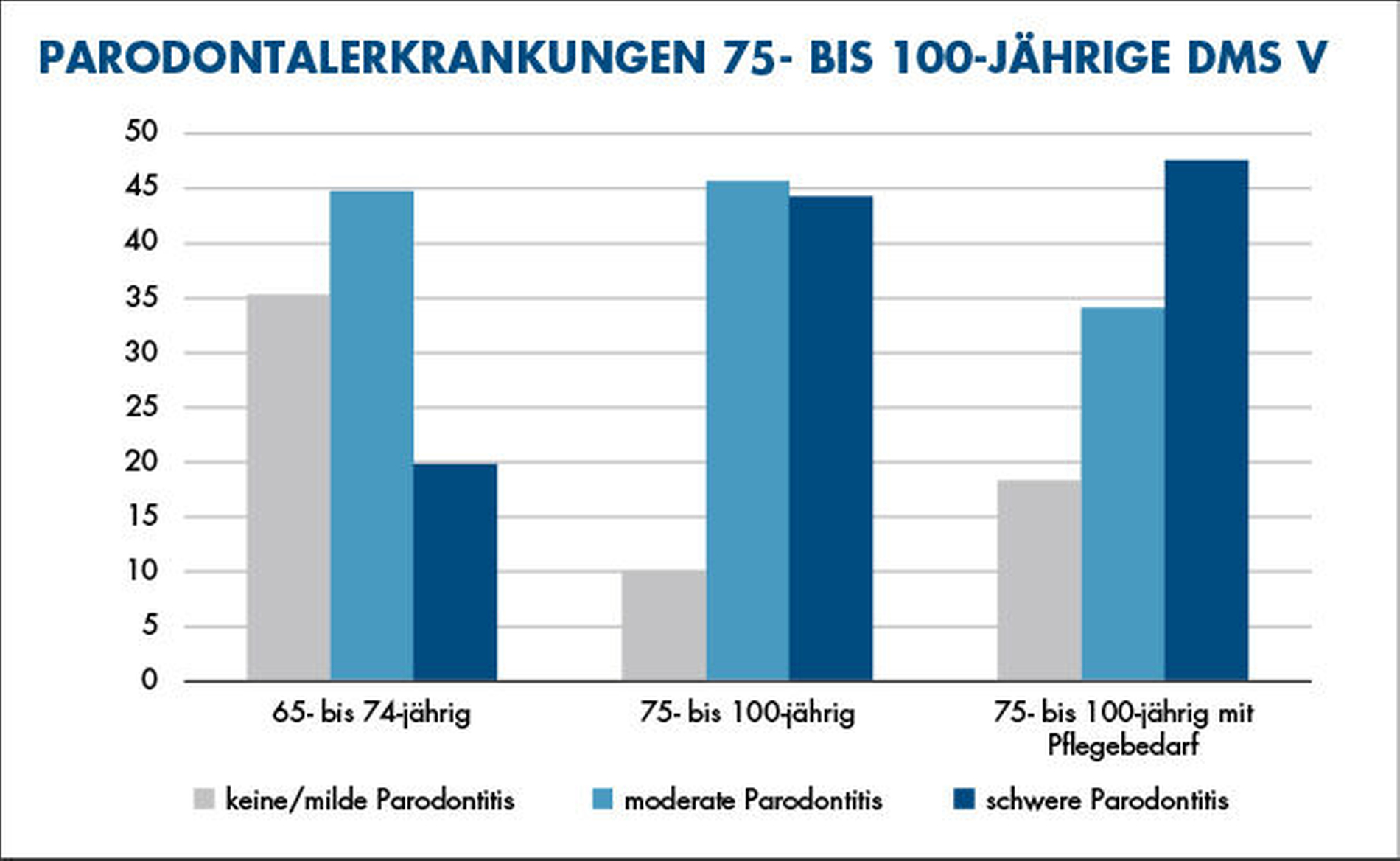 Eine reduzierte Mundhygienefähigkeit spiegelt sich unter anderem in dokumentierten Sondierungsblutungen (Bleeding on Probing – BoP) bei etwa 65 Prozent der älteren Senioren mit Pflegebedarf wider. Wenn auch die Prävalenz von parodontalen Erkrankungen in der Gesamtbevölkerung zurückgegangen ist, ist die Erkrankungslast im höheren Lebensalter massiv und hat sich in den vergangenen Jahrzehnten vom mittleren ins höhere und höchste Lebensalter verlagert. So gibt es bei den jüngeren Senioren (65- bis 74-jährig) einen rückläufigen Trend im Vergleich zur DMS IV bei der Parodontitis trotz einer zunehmenden Zahl erhaltener Zähne, bei den 75- bis 100-Jährigen und Menschen mit Pflegebedarf sind aber über 80 Prozent von moderater oder schwerer Parodontitis, gemessen an der CDC/AAP-Klassifikation, betroffen (Abbildung 2).