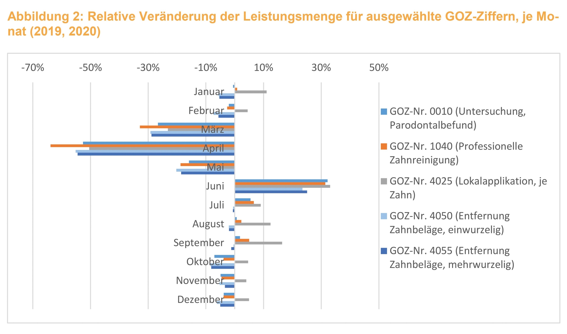 Die COVID-19-Pandemie hat auch die zahnärztliche Gesundheitsversorgung beeinflusst. Angesichts der Einschränkungen während der Pandemiewellen lässt sich der Rückgang der Leistungsmengen im Pandemiejahr 2020 aber als sehr moderat bezeichnen. Die Gesamtzahl der abgerechneten zahnärztlichen Leistungen bei Privatversicherten sank von 2019 zu 2020 lediglich um drei Prozent. Während der ersten COVID-19-Welle war im April und im Mai 2020 zwar ein deutlicher Rückgang der Inanspruchnahme zu verzeichnen. Diesem Rückgang folgte jedoch bereits ab Juni 2020 eine deutliche Zunahme gegenüber den Vorjahreswerten, so dass hier zeitnah Nachholeffekte zu beobachten waren. Im Zuge der zweiten Pandemiewelle ab September 2020 sind keine erkennbaren Auswirkungen auf die zahnärztliche Versorgung feststellbar.