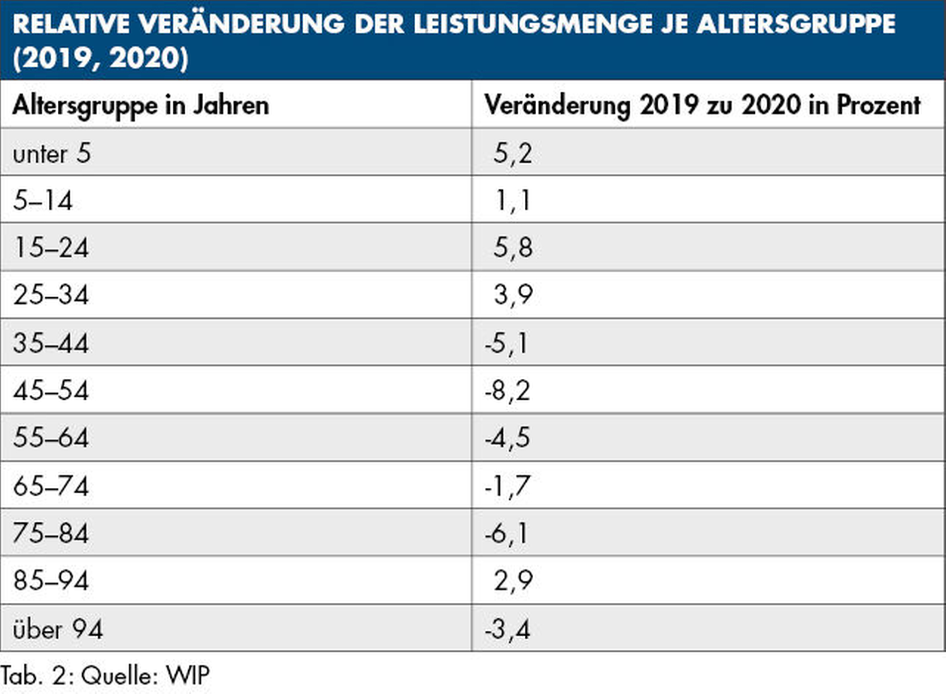 Bei einer Betrachtung der Veränderung der Leistungsmenge je Altersgruppe (Tabelle 2) wird deutlich, dass besonders bei Personen im Alter zwischen 35 und 84 Jahren weniger Leistungen abgerechnet wurden als im Vorpandemiejahr 2019. Bei Personen unter 34 Jahren wurden dagegen trotz Pandemiejahr 2020 mehr Leistungen abgerechnet, ebenso wie bei Personen zwischen dem 85. und dem 94. Lebensjahr. Diese abweichenden Änderungen der abgerechneten Leistungen über das Alter liefert damit Anhaltspunkte für eine altersabhängige Veränderung der zahnärztlichen Inanspruchnahme und damit auch altersabhängige Vermeidungseffekte.