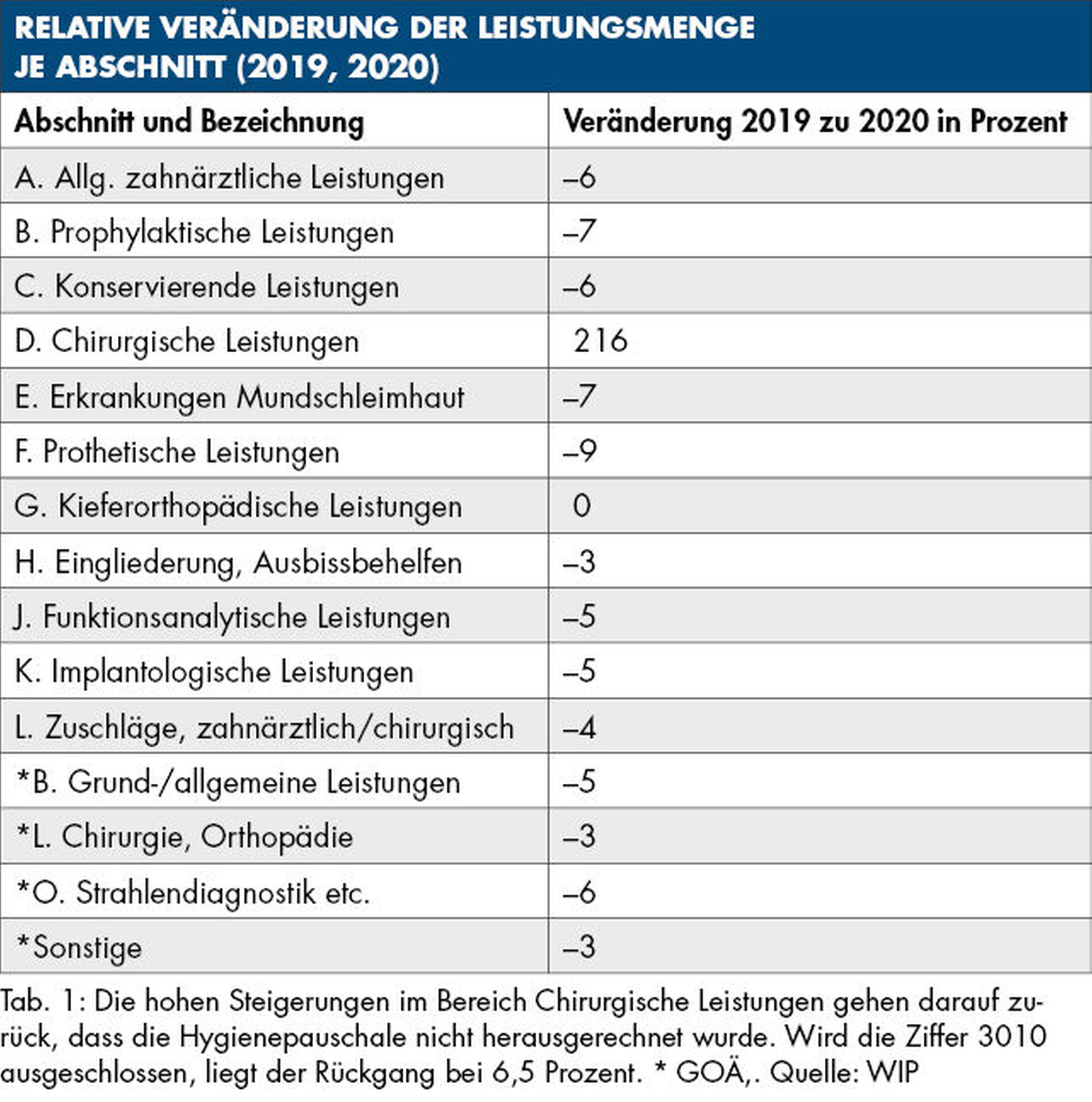 Wie Tabelle 1 verdeutlicht, ging im Bereich Prothetische Leistungen (Abschnitt F) die Anzahl der abgerechneten Leistungsmengen im Jahr 2020 mit 9 Prozent am stärksten zurück. Ziffern aus den Abschnitten B (Prophylaktische Leistungen) und E (Erkrankungen Mundschleimhaut) wurden 7 Prozent weniger häufig abgerechnet.