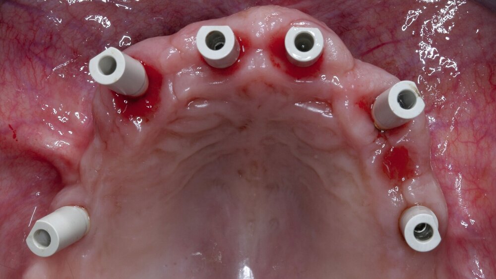 Die Arbeitsgruppe um Konstantinos Chochlidakis aus Rochester, USA, versuchte, diese Fragestellung gemeinsam mit der Tufts Universität aus Boston im Rahmen einer kliniknahen Laboruntersuchung zu beantworten. Dafür erstellten sie ein Gipsmodell des Oberkiefers mit insgesamt vier Implantaten, jeweils in der Position der lateralen Schneidezähne und der zweiten Prämolaren. Auf diesem Modell wurde eine verschraubbare Zirkonoxidbrücke auf Abutmentniveau angefertigt. Diese Restauration diente als Pendant zum klinischen Langzeitprovisorium, dessen Außenform im Doppelscanverfahren auf die definitive Versorgung übertragen wird. Es wurden also zwei Scans mit einem Intraoralscanner (Trios, 3shape A7S, Kopenhagen, Dänemark) angefertigt: einmal die Implantate (beziehungsweise Analoge) mit den Scanpfosten des Systems und einmal das Langzeitprovisorium, montiert auf dem Modell.