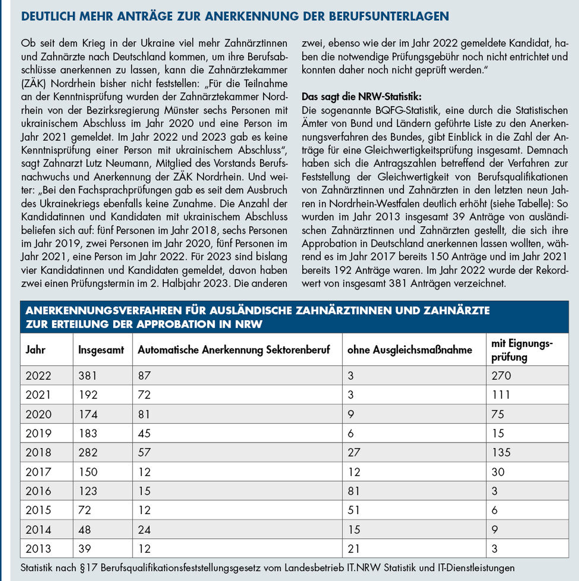 Alternativ kann die Gleichwertigkeit durch erfolgreiche Teilnahme an einer Kenntnisprüfung bei der Zahnärztekammer nachgewiesen werden. Wie die Zahnärztekammer Nordrhein uns berichtet, wird die Klausur zur Kenntnisprüfung gemäß den Vorgaben der Approbationsordnung für Zahnärztinnen und Zahnärzte (ZApprO) zweimal im Jahr durchgeführt. Jeder „Erst“-Gemeldete erhalte somit definitiv die Gelegenheit zur Teilnahme. Die Wartezeit für die Teilnahme an der Klausur sei jedoch abhängig von dem Meldezeitpunkt des Kandidaten bei der Zahnärztekammer, die darauf keinen Einfluss habe.
