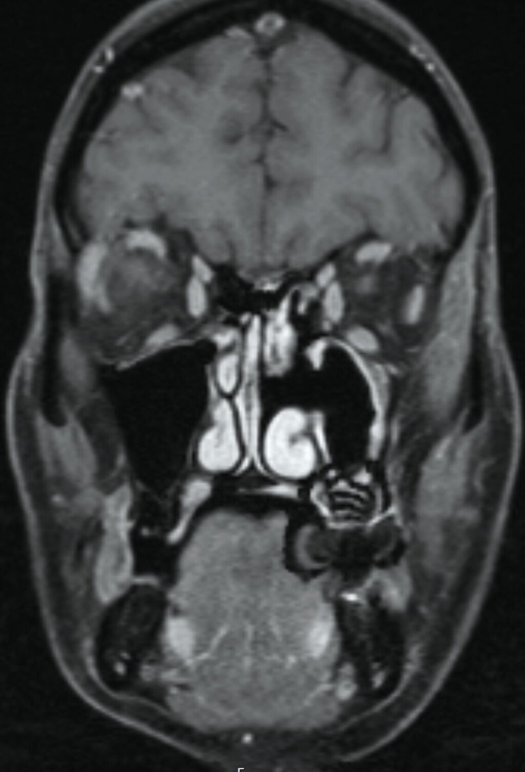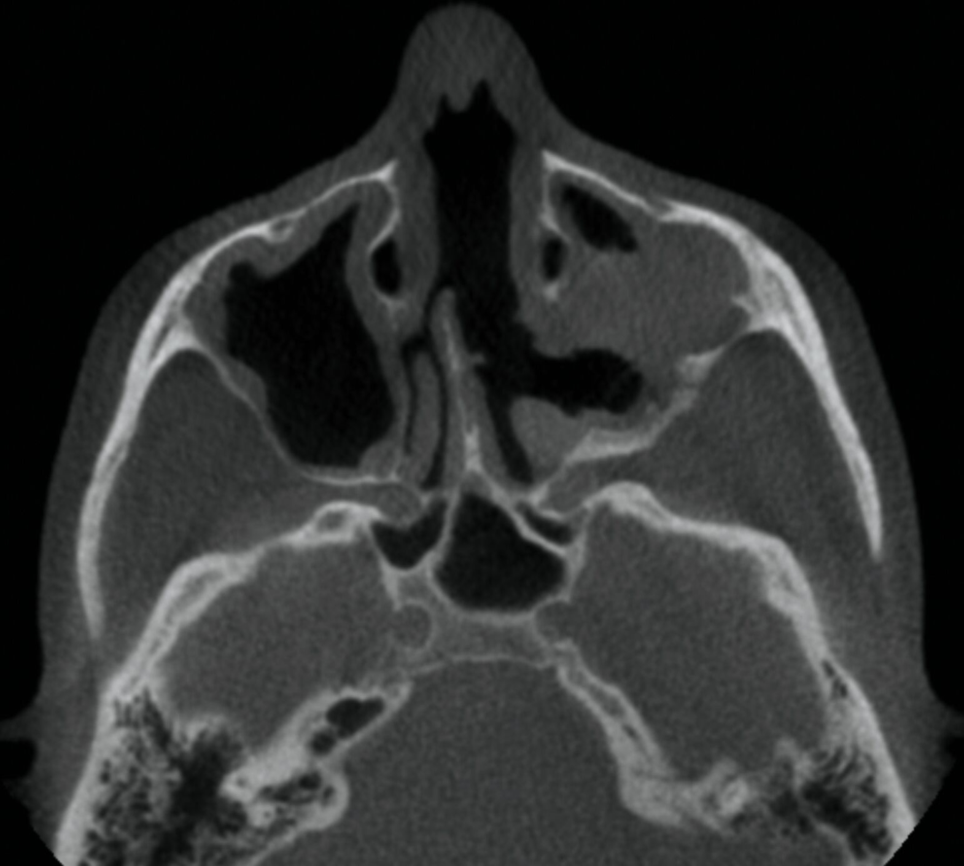 Im Verlauf stellte sich die Patientin trotz stringent eingehaltener Medikation mit erneut verstärkten Schmerzepisoden vor. Die Patientin assoziierte dies mit im Bereich der Kiefer – infolge einer im Vorfeld erfolgten Operation – vorhandenem Osteosynthesematerial zur Re-Fixierung des Kieferhöhlendeckels alio loco. Dies war von eitrigem Ausfluss aus der linken Nase begleitet. In der erweiterten Bildgebung mittels Magnetresonanztomografie zeigte die Patientin eine diffuse Kontrastmittelanhebung des Nervus infraorbitalis bildmorphologisch einer Neuritis entsprechend sowie eine diffuse Kontrastmittelanhebung des kranio-lateralen Kieferhöhlenknochens, teils mit Destruktion der kortikalen Strukturen, was den Verdacht einer Osteomyelitis nahelegte (Abbildung 4). Im zusätzlich angefertigten DVT konnte der Verdacht auf basale Aufhellung des linken Kieferhöhlenbodens bestätigt werden (Abbildung 5). Um eine definitive antimikrobielle Therapie und Diagnosesicherung zu ermöglichen, wurde die Entscheidung zur endoskopischen Probeentnahme gestellt.