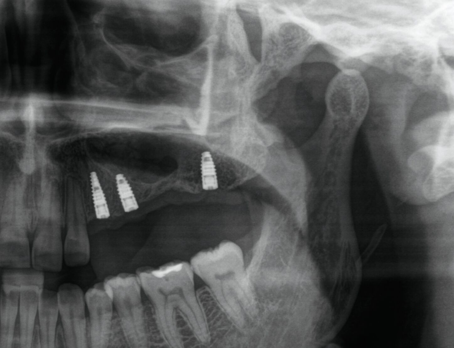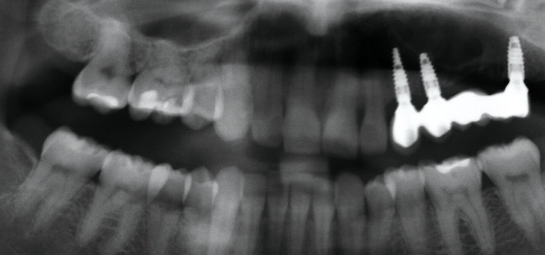Eine 35-jährige Patientin stellte sich immer wieder mit rezidivierenden Schmerzen der linken Gesichtshälfte bei mehreren Ärzten vor. Die Beschwerden bestanden seit Jahren. Schon im Vorfeld waren mehrfach bei chronischer Sinusitis eine Kieferhöhlenrevision sowie eine Infundibulotomie linksseitig erfolgt. Regelmäßig kam es zu erneuten eitrigen Entzündungen. Die fraglichen Fokuszähne des zweiten Quadranten 24–27 waren vor einigen Jahren entfernt worden (Abbildung 1). 2017 war eine komplikationslose implantologisch-prothetische Versorgung der Freiendsituation erfolgt (Abbildungen 2 und 3).
