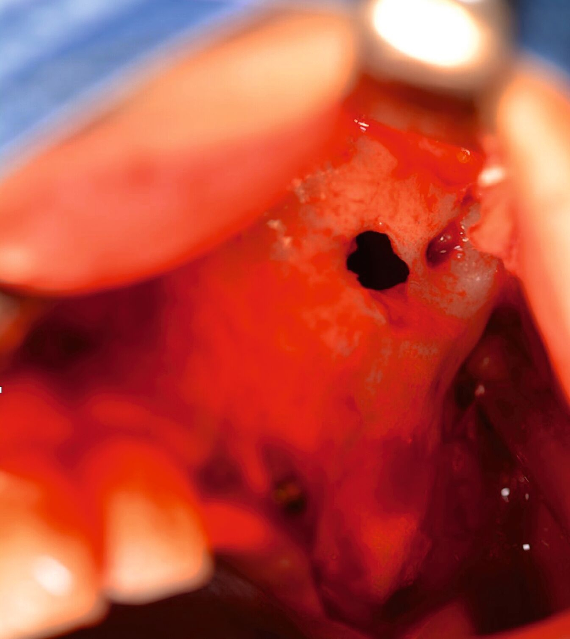 Intraoperativ zeigte sich eine reizlose intakte Kieferhöhlenvorderwand mit Osteosyntheseschrauben ohne Anhalt für Lockerung oder Superinfektion (Abbildung 6). Die Schrauben wurden komplikationslos vollständig entfernt; die anteriore Kieferhöhlenwand zeigte sich als gut verheilt (Abbildung 7). Mittels transnasaler Endoskopie wurde über den vorhandenen Infundibulotomiedefekt eine mikrobiologische und histopathologische Probe entnommen. Klinisch zeigte sich eine Polyposa und gräulich-brauner Detritus.