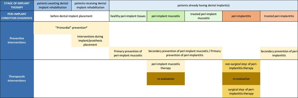 Herrera, D., Berglundh, T., Schwarz, F., Chapple, I., Jepsen, S., Sculean, A., Kebschull, M., Papapanou, P. N., Tonetti, M. S., Sanz, M., & on behalf of the EFP workshop participants and methodological consultant (2023). Prevention and treatment of peri-implant diseases. The EFP S3 level clinical practice guideline. Journal of Clinical Periodontology, 1–73. doi.org/10.1111/jcpe. 13823.