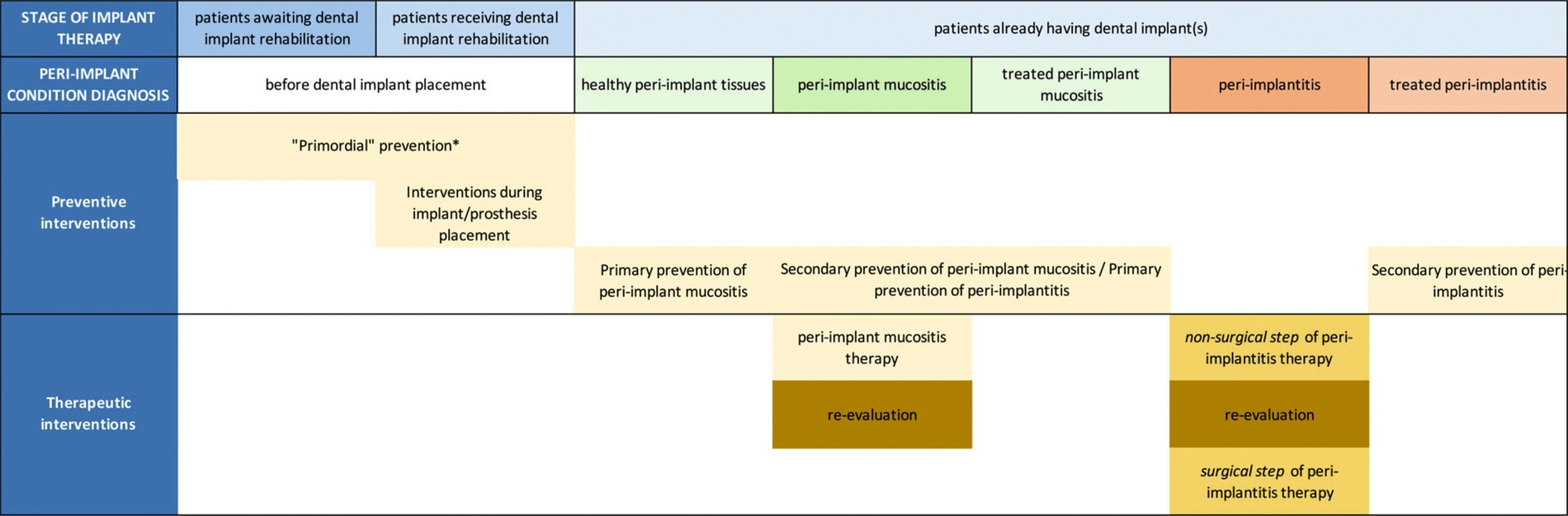 Da ein Kontinuum von periimplantärer Gesundheit über das Auftreten einer Mukositis bis hin zur Periimplantitis besteht, wird das Management einer Mukositis als primäre Prävention der Periimplantitis angesehen. Maßnahmen der sekundären Prävention sollen das Wiederauftreten einer Mukositis beziehungsweise Periimplantitis nach deren erfolgreicher Behandlung verhindern (Abbildung 1).