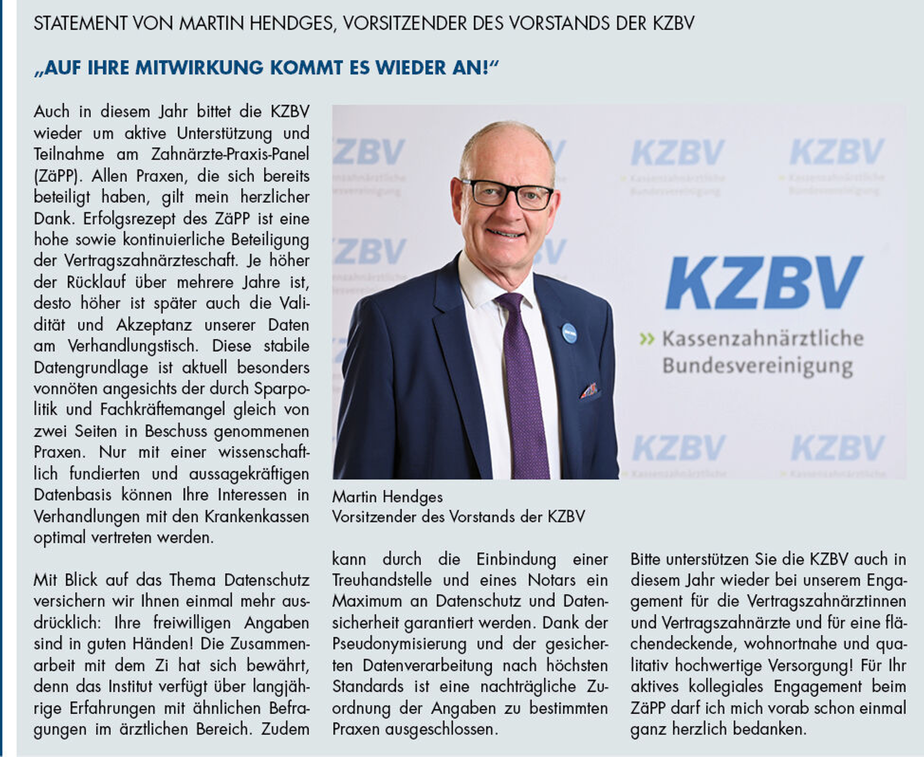 Die KZBV ist sich bewusst, dass mit der Bearbeitung der Unterlagen ein erheblicher Aufwand verbunden ist. Die Rücksendung der vollständig ausgefüllten Unterlagen wird deshalb auch in diesem Jahr finanziell honoriert. Wer bereits im Jahr 2022 beim ZäPP dabei war, muss nur die Daten für ein Jahr ausfüllen – und erhält dennoch die gleiche finanzielle Anerkennung.