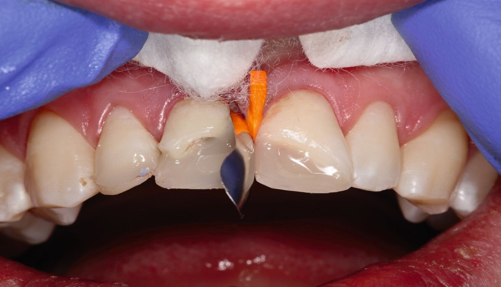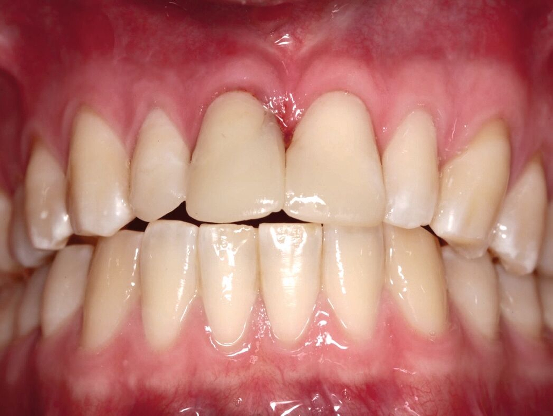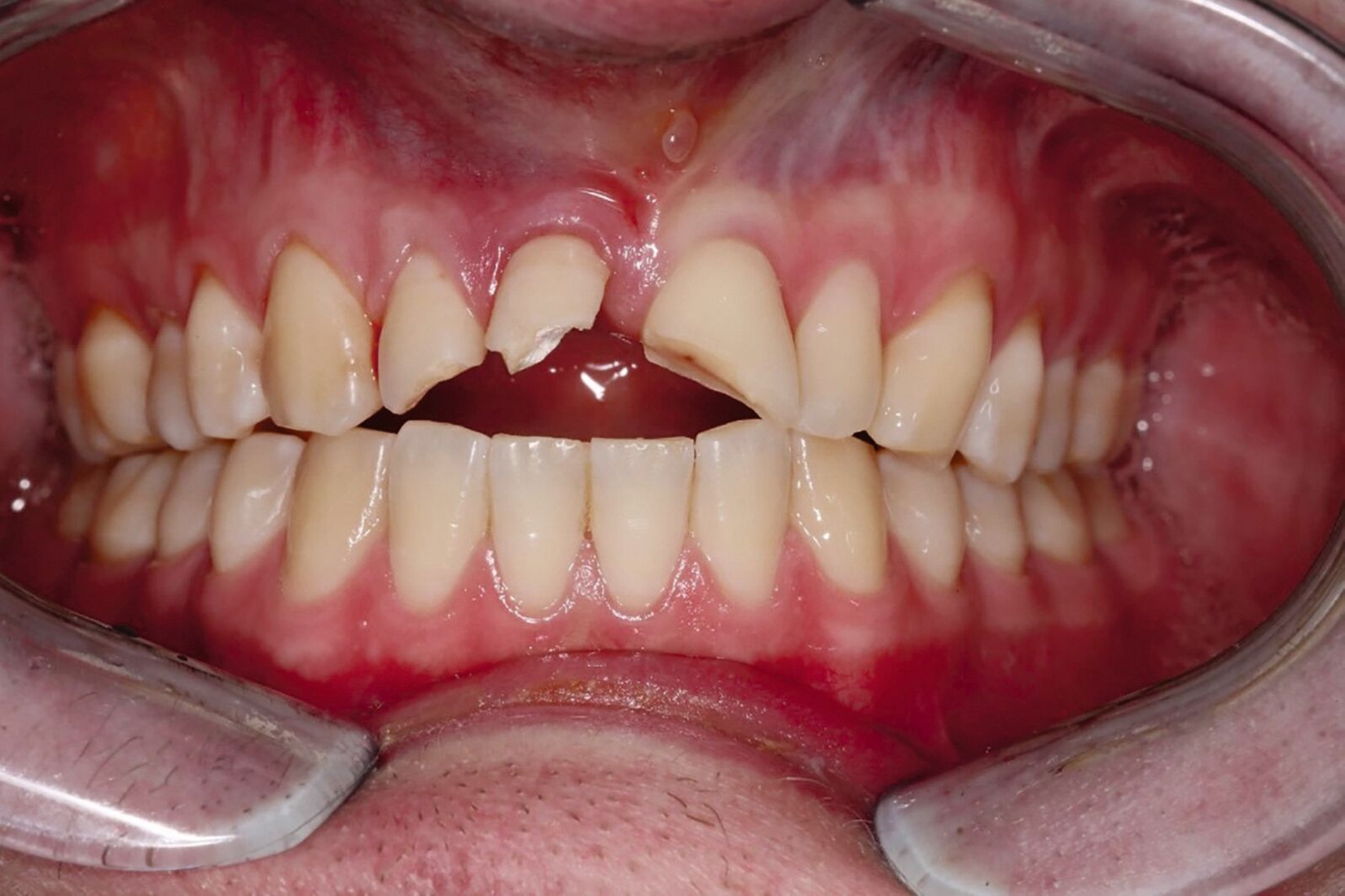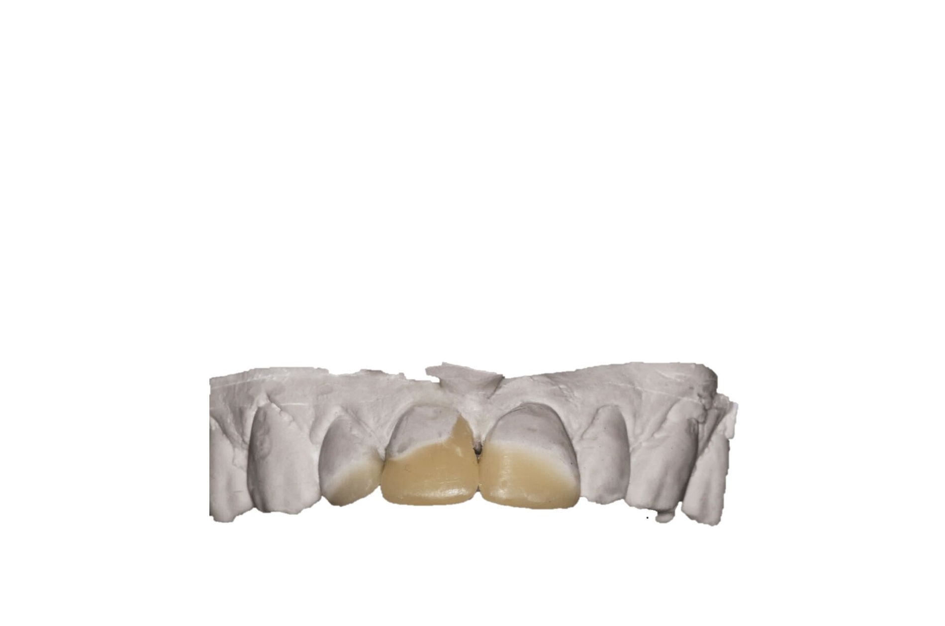 Im Rahmen der Notfallversorgung wurden die Dentinwunden an Zahn 12 provisorisch mit Glasionomerzement verschlossen und die Zähne 11 und 21 mit Kalziumhydroxid-Präparaten direkt überkappt und anschließend dentinadhäsiv versiegelt. Im Verlauf wurde ein Wax-Up für direkte provisorische Kompositaufbauten hergestellt (Abbildung 4). Zur semipermanenten Versorgung musste per Elektrotom mesial und palatinal an Zahn 11 Gingiva exzidiert werden, um einen adäquaten Zugang und eine suffiziente Kontrolle des Arbeitsfeldes zu gewährleisten (Abbildung 5). Durch die direkte provisorische Restauration war der Patient sofort versorgt. Er konnte ohne größere Beeinträchtigung am sozialen Leben teilnehmen und hatte so Zeit für die endgültige Therapieentscheidung (Abbildungen 6 bis 8).