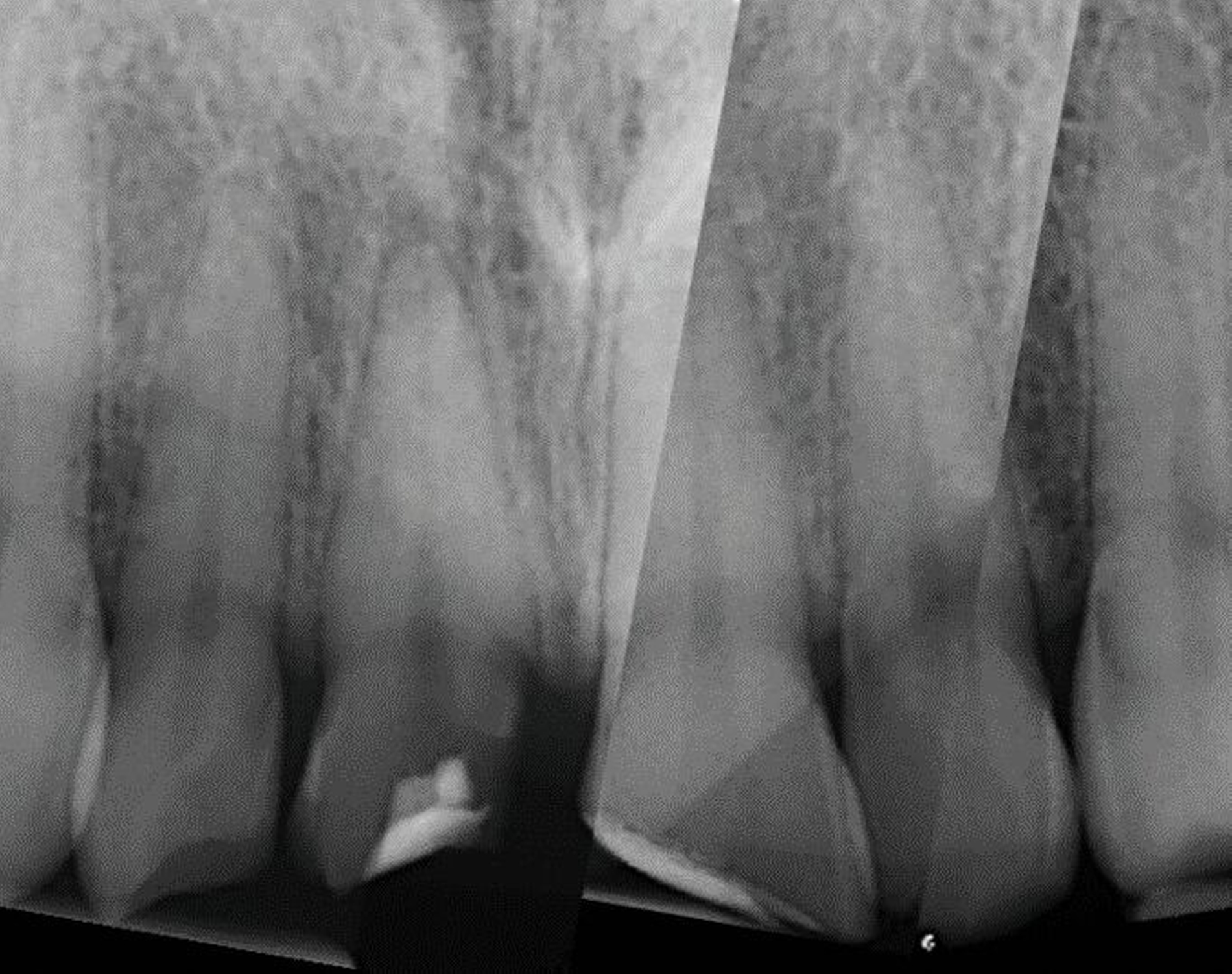 Ein 22-jähriger Patient stellte sich im Februar 2020 im zahnärztlichen Notdienst der Klinik für Zahn-, Mund- und Kieferkrankheiten Mainz vor. Aufgrund einer Synkope war er mit dem Oberkiefer auf den Rand einer Badewanne gestürzt. Intraoral zeigte sich der Zahn 12 mit einer Schmelz-Dentin-Fraktur ohne Pulpabeteiligung (unkomplizierte Kronenfraktur), der Zahn 11 mit einer Kronen-Wurzel-Fraktur mit Pulpabeteiligung und der Zahn 21 mit einer Schmelz-Dentin-Fraktur mit Pulpabeteiligung (komplizierte Kronenfraktur). Die Zähne zeigten keine erhöhten Lockerungsgrade oder Dislokationen (Abbildung 2). Herausfordernd für die weitere Versorgung war der Frakturverlauf an Zahn 11, an dem die Frakturkante palatinal tief subgingival und mesio-palatinal auch subkrestal lag. Röntgenologisch konnte die klinisch gestellte Verdachtsdiagnose bestätigt und eine Wurzelfraktur ausgeschlossen werden (Abbildung 3).