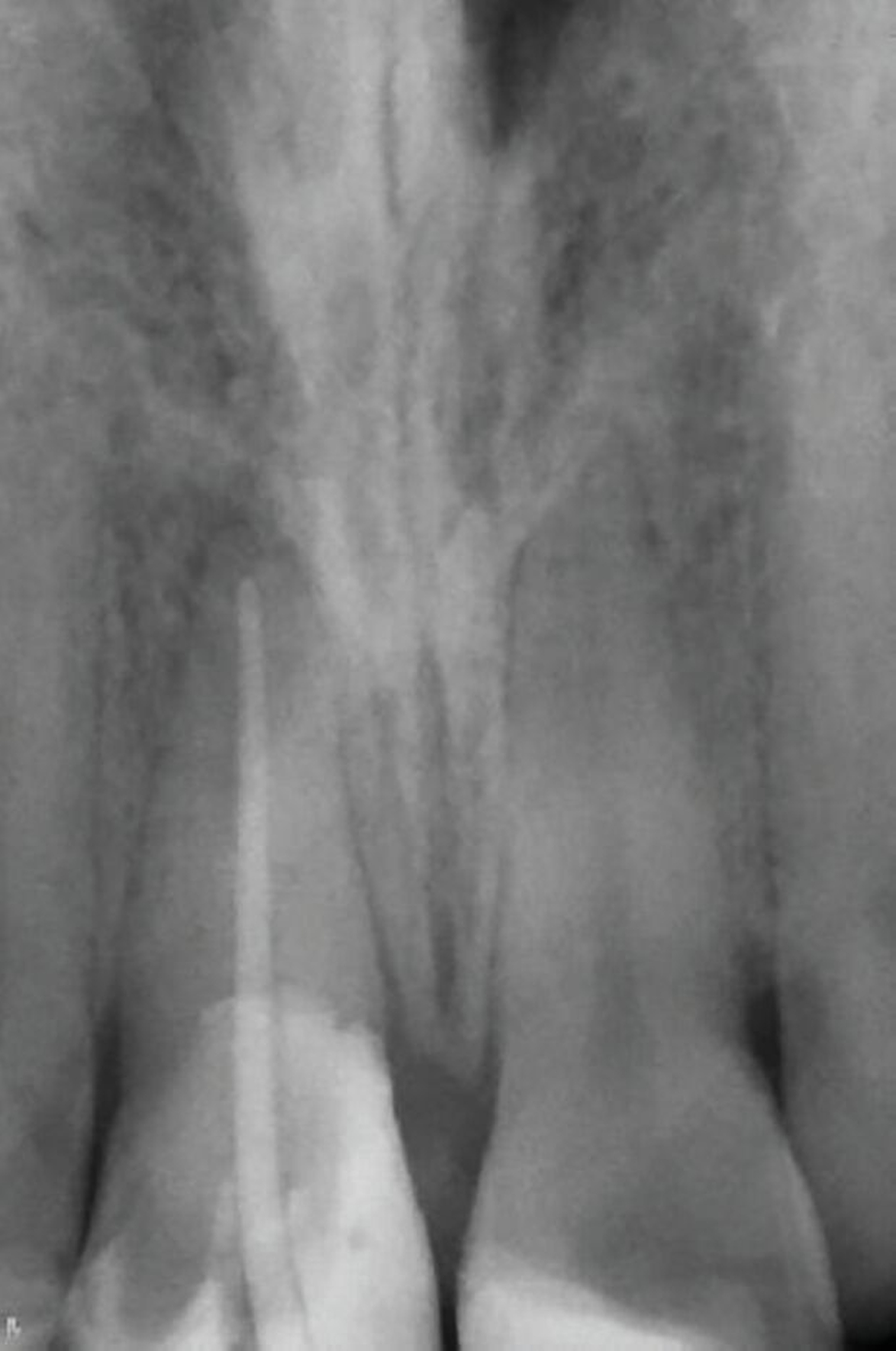 Dem Patienten war der Erhalt der natürlichen Dentition wichtig. Dementsprechend wurde er darüber aufgeklärt, dass Zahn 11 aufgrund des tiefen Frakturverlaufs nicht ohne weiteres restaurativ versorgt werden kann. Deshalb wurde zusammen mit der Poliklinik für Kieferorthopädie die Extrusion des Zahnes – ohne kieferorthopädische Behandlung der Malokklusion – geplant. Da Zahn 11 Symptome einer irreversiblen Pulpitis zeigte, bestand die Indikation zur endodontischen Therapie (Abbildung 9).