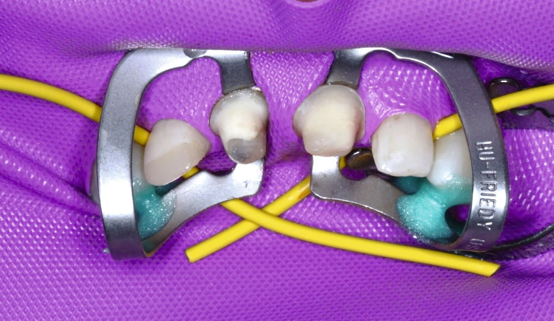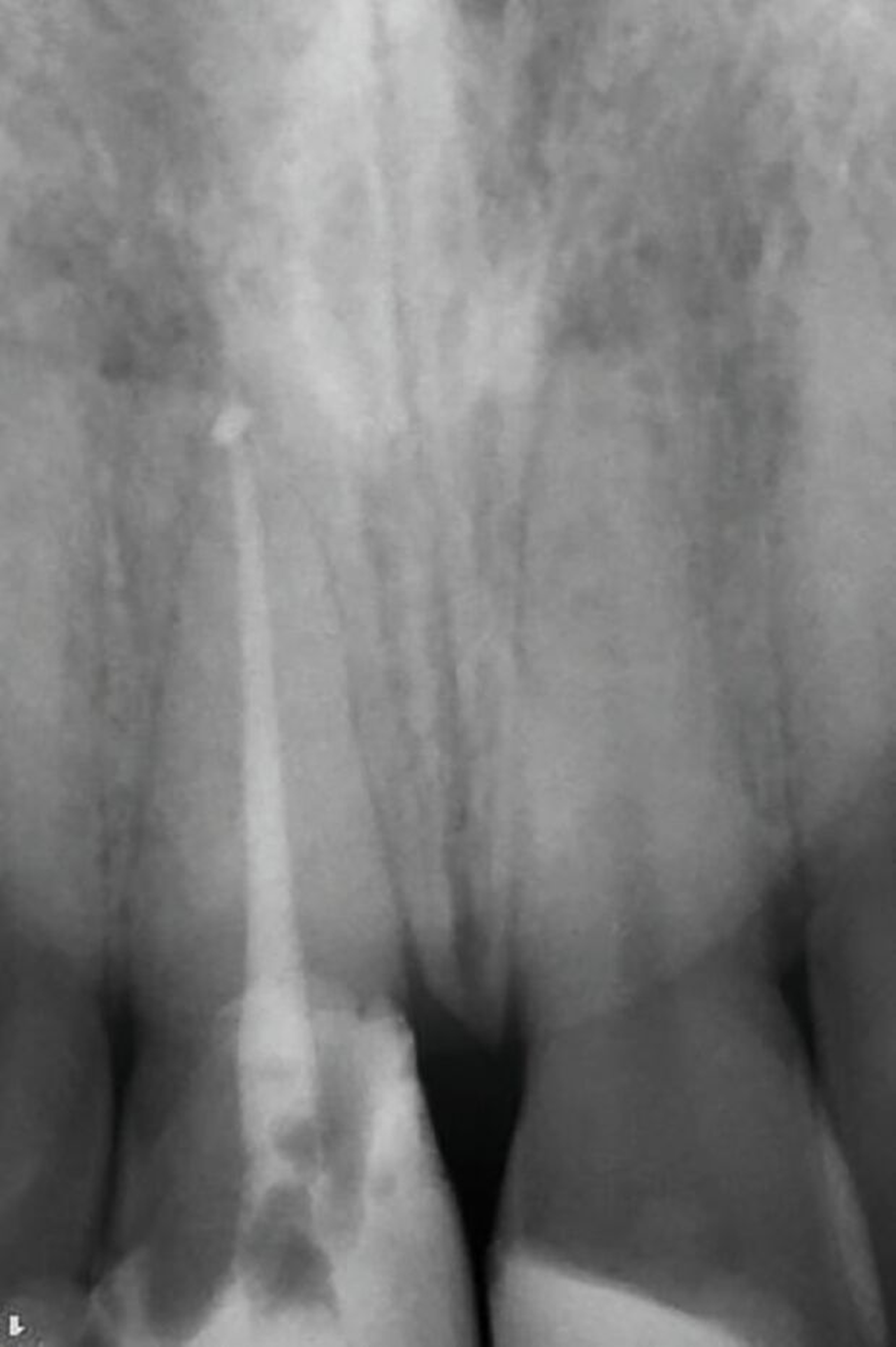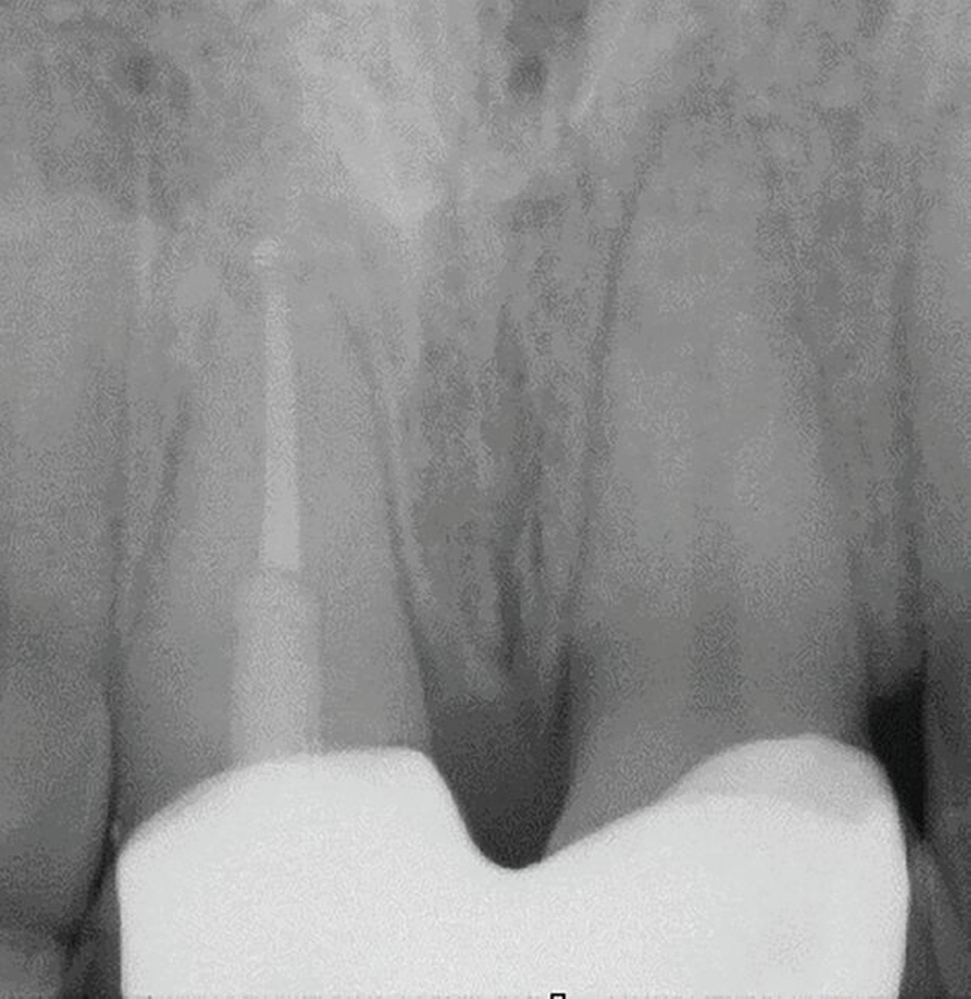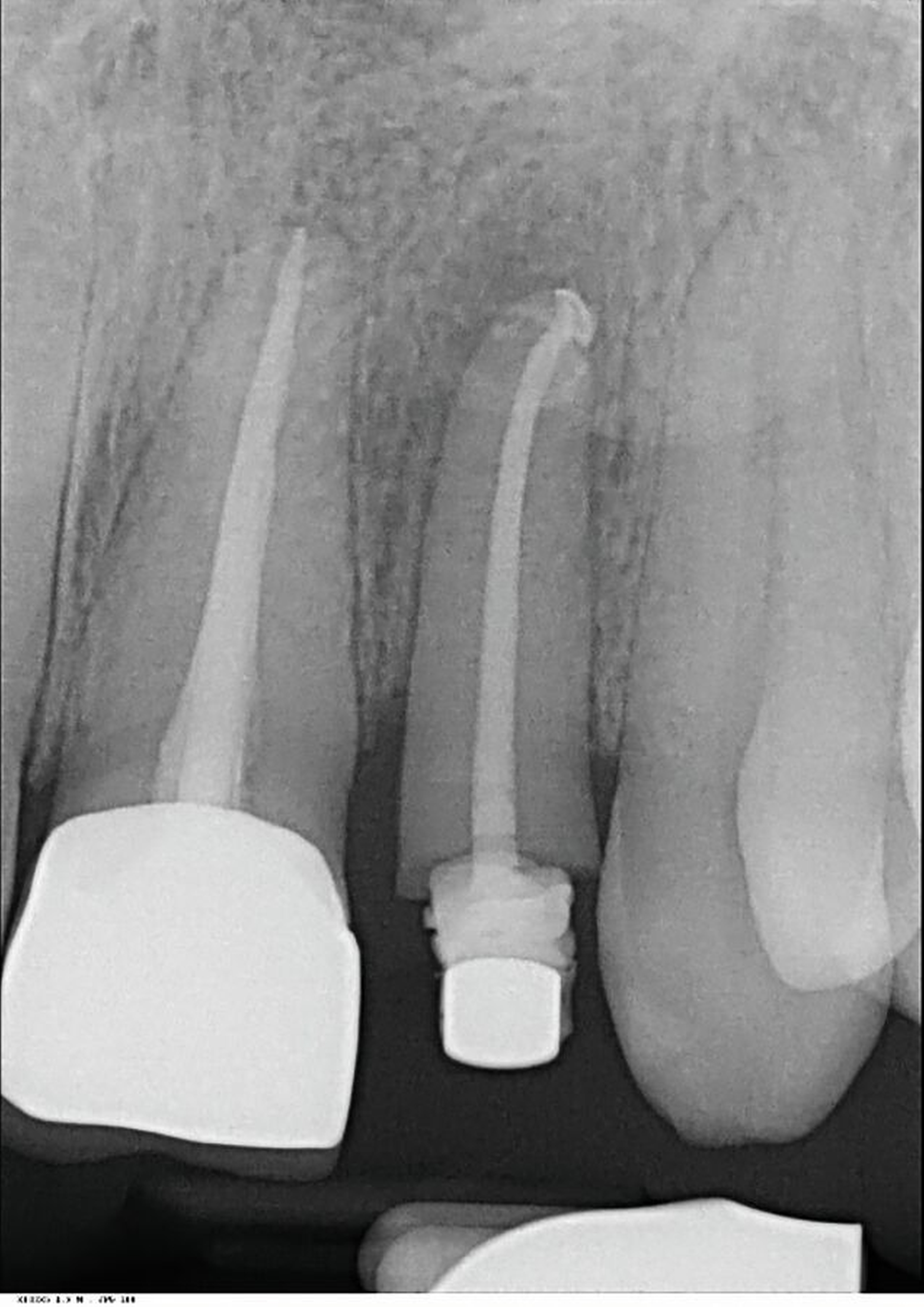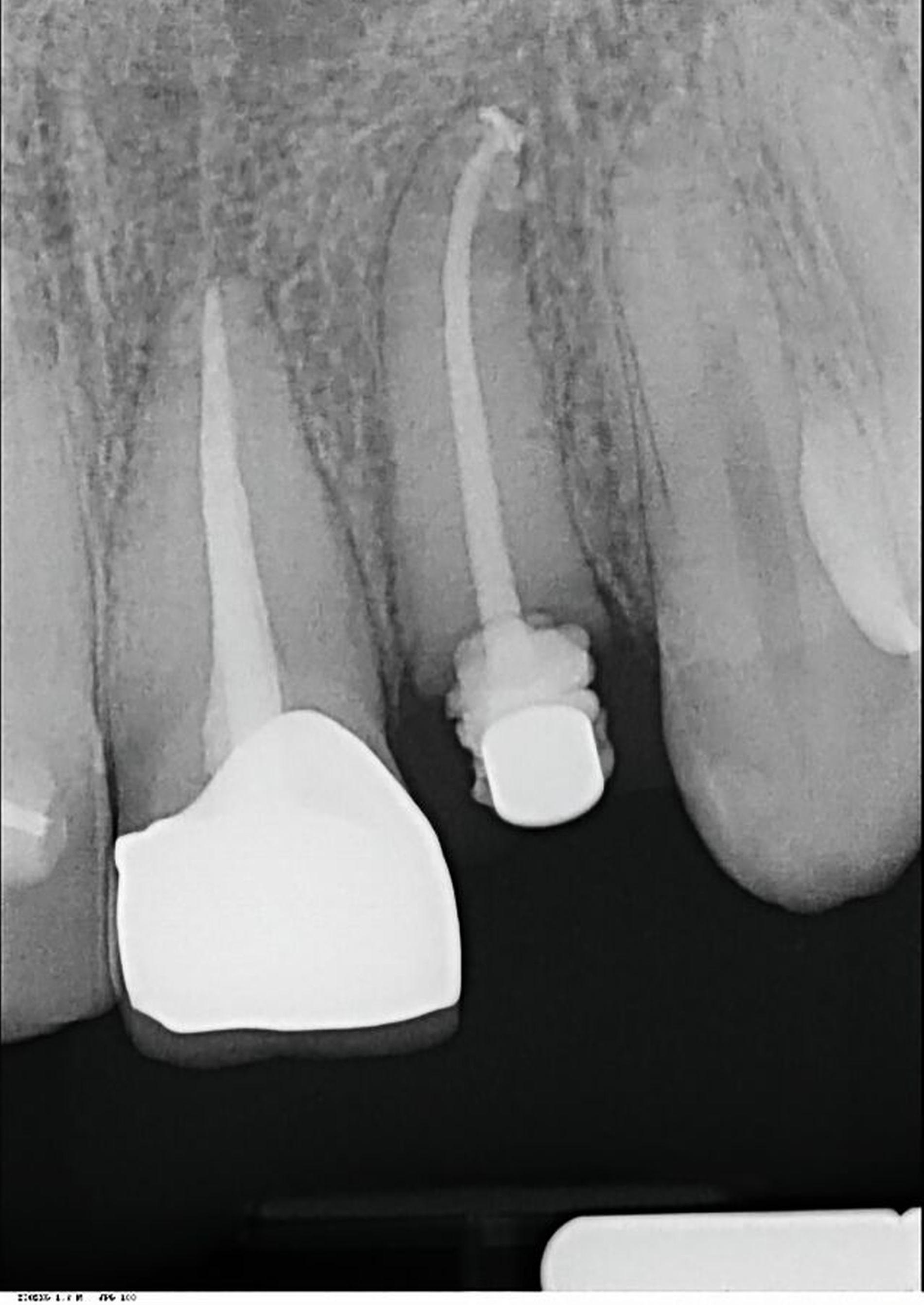 Als die Wurzel des Zahnes 22 ausreichend extrudiert war, wurde ein adhäsiver Stift-Stumpf-Aufbau inseriert (Abbildungen 24 und 25). Die Krone an Zahn 21 wurde entfernt, da diese durch das Trauma inzisal beschädigt worden war und der Patient eine Neuanfertigung wünschte.