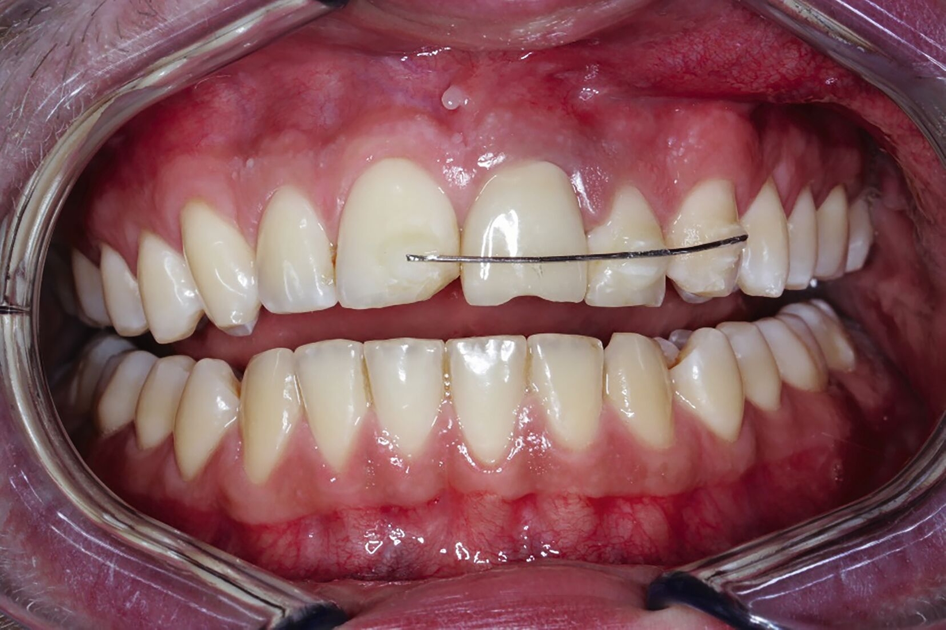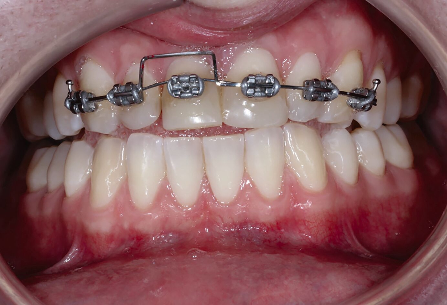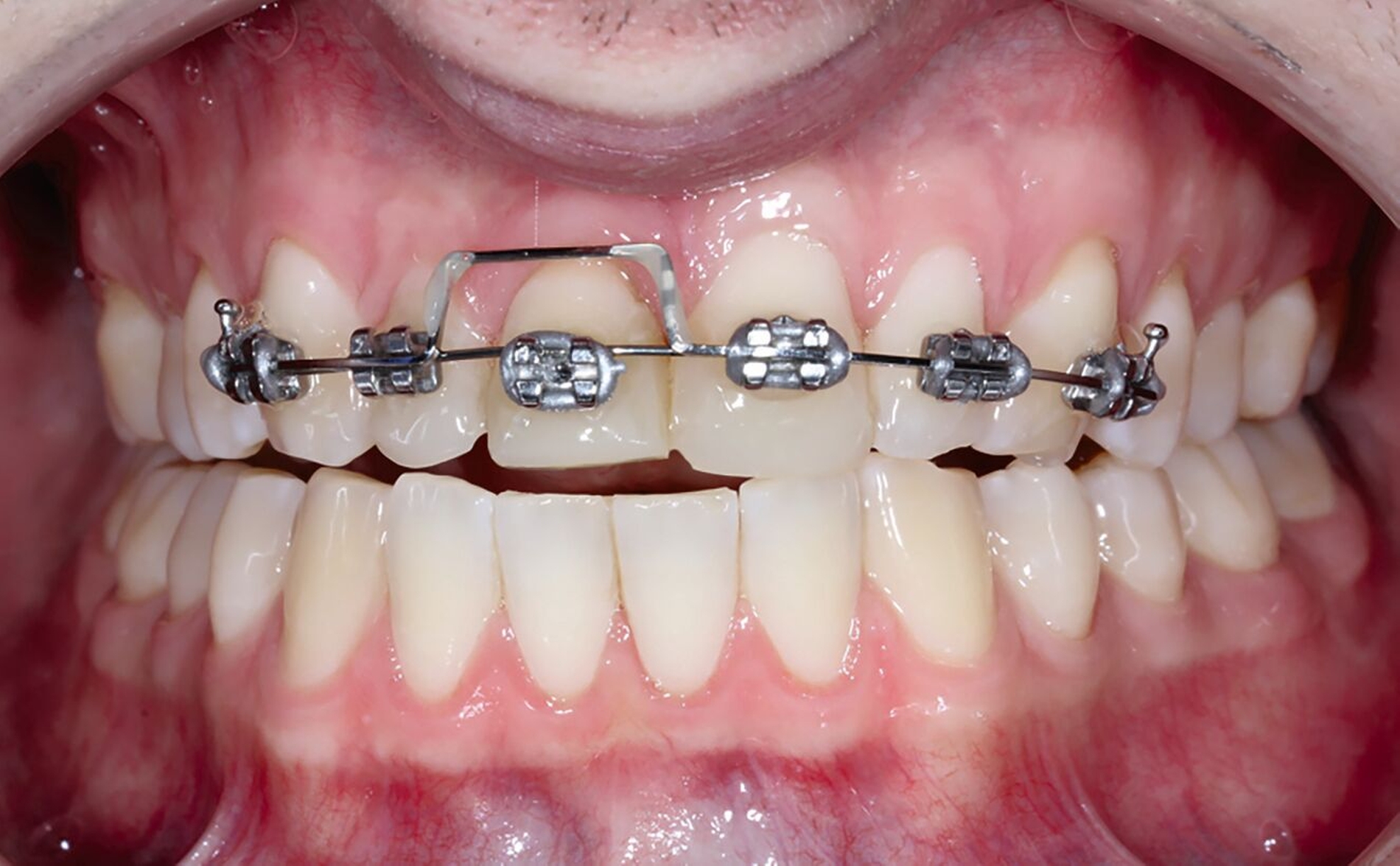 Nachfolgend konnte die Multibracket-Apparatur (MBA) für die Extrusion in Segmentbogentechnik befestigt werden (Abbildung 10). Dazu wurden die zu beklebenden Kompositflächen mit Aluminiumoxid-Pulver gestrahlt und mit einem Silan-haltigen Haftvermittler benetzt. Anschließend wurde drei Monate die kieferorthopädische Extrusionstherapie durchgeführt (Abbildungen 10 bis 12). Der Patient stellte sich wöchentlich zur Fibrotomie vor, um eine Verlagerung der Gingiva nach koronal zu vermeiden. Aufgrund der nach koronal gerichteten Bewegung erfolgte im Bedarfsfall das Einkürzen der Schneidekante.