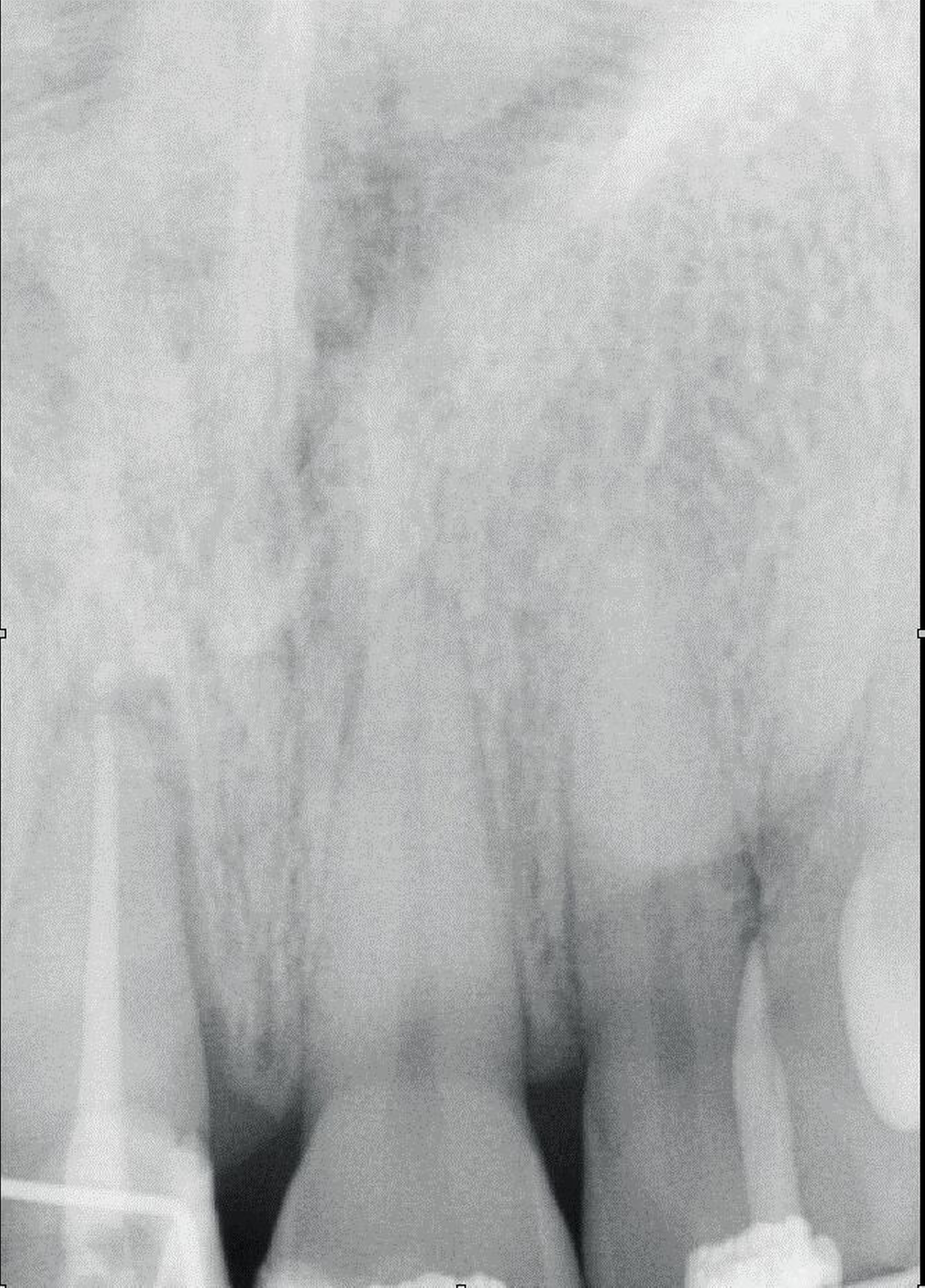 Ein 29-jähriger Patient wurde nach Lockerung seiner Traumaschienung bei uns vorstellig. Er berichtete über ein vier Tage zuvor erlittenes Trauma und eine Erstversorgung alio loco, bei der eine Lockerung (Grad II) an Zahn 22, eine Beschädigung der Krone 21 sowie eine Schmelzfraktur an Zahn 11 festgestellt wurde (Abbildung 18). Eine Röntgendiagnostik war alio loco nicht erfolgt.