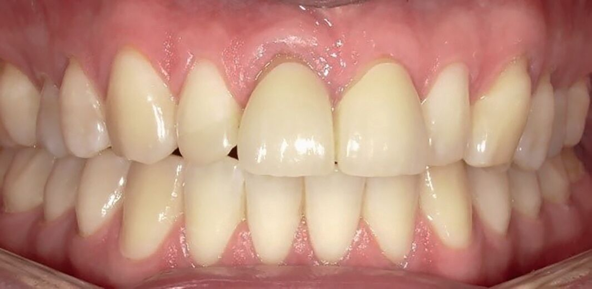 Die Zähne 11 und 21 wurden nach Abschluss der kieferorthopädischen Behandlung mit Lithiumdisilikat-Keramikkronen versorgt (Abbildungen 14 bis 16). Durch die Extrusion waren das Fassen der Frakturkante und die Etablierung des Ferrule-Effekts nun ohne Probleme möglich. Die Eingliederung der Arbeit konnte unter absoluter Trockenlegung erfolgen. Die nach dem Einsetzen angefertigte Einzelzahnaufnahme zeigt die präzise Adaptation der Kronen sowie Umbauprozesse des Alveolarkamms. Drei Jahre nach Therapieabschluss zeigt sich eine suffiziente klinische Situation (Abbildung 17).