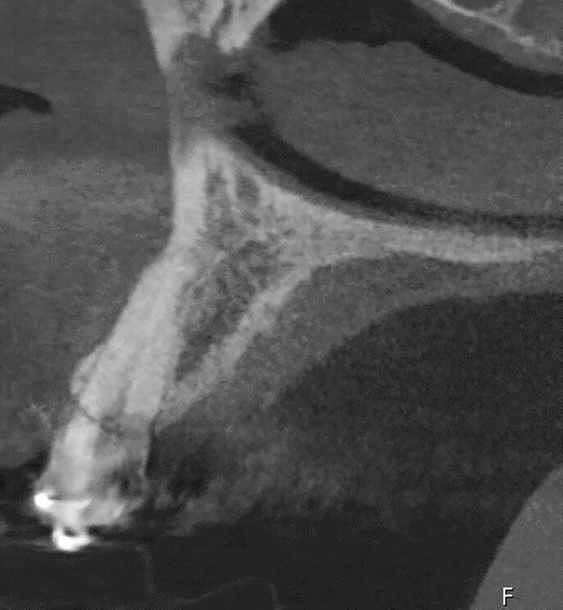 Anhand der von uns durchgeführten Einzelzahnaufnahme konnte die alio loco gestellte Erstdiagnose korrigiert werden: Wurzelfraktur des Zahnes 22 mit Kommunikation zur Mundhöhle (Abbildung 19). Der Patient favorisierte nach Diagnosesicherung zunächst Zahnersatz an 22 durch ein Sofortimplantat, weshalb eine DVT-Aufnahme zur weiteren Planung angefertigt wurde (Abbildung 20). In der Aufnahme zeigte sich jedoch, dass keine suffiziente vestibuläre Knochenlamelle vorhanden und somit der Erfolg eines Sofortimplantats nicht sicher vorhersagbar war. Nach umfassender Aufklärung entschied sich der Patient für den Zahnerhalt und eine Extrusion mit Magneten (Abbildungen 21 bis 24).