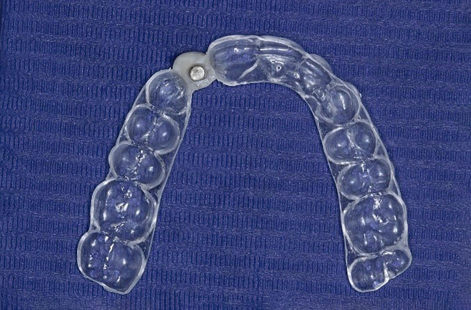 In Fall 2 wurde die Extrusion mit einem Magneten durchgeführt. Hier wird mittels Säure-Ätz-Technik ein Magnet mit 3 mm Durchmesser auf den verbliebenen Wurzelrest geklebt. Der Gegenmagnet wurde im Abstand von circa 2 mm in eine Tiefziehschiene einpolymerisiert. Dadurch war der Patient gleichzeitig für die Extrusionszeit provisorisch versorgt. Hilfreich ist hier ein im Vorfeld angefertigter, wenig resilienter Platzhalter. Des Weiteren hat dieses Vorgehen den Vorteil, dass die axiale Ausrichtung bereits optimal angepasst werden kann. Nach Bedarf sollten der Magnet weiter nach inzisal versetzt und eine Fibrotomie durchgeführt werden, bis der Wurzelrest ausreichend extrudiert ist.