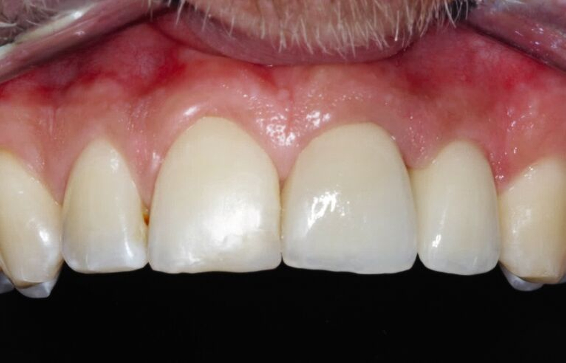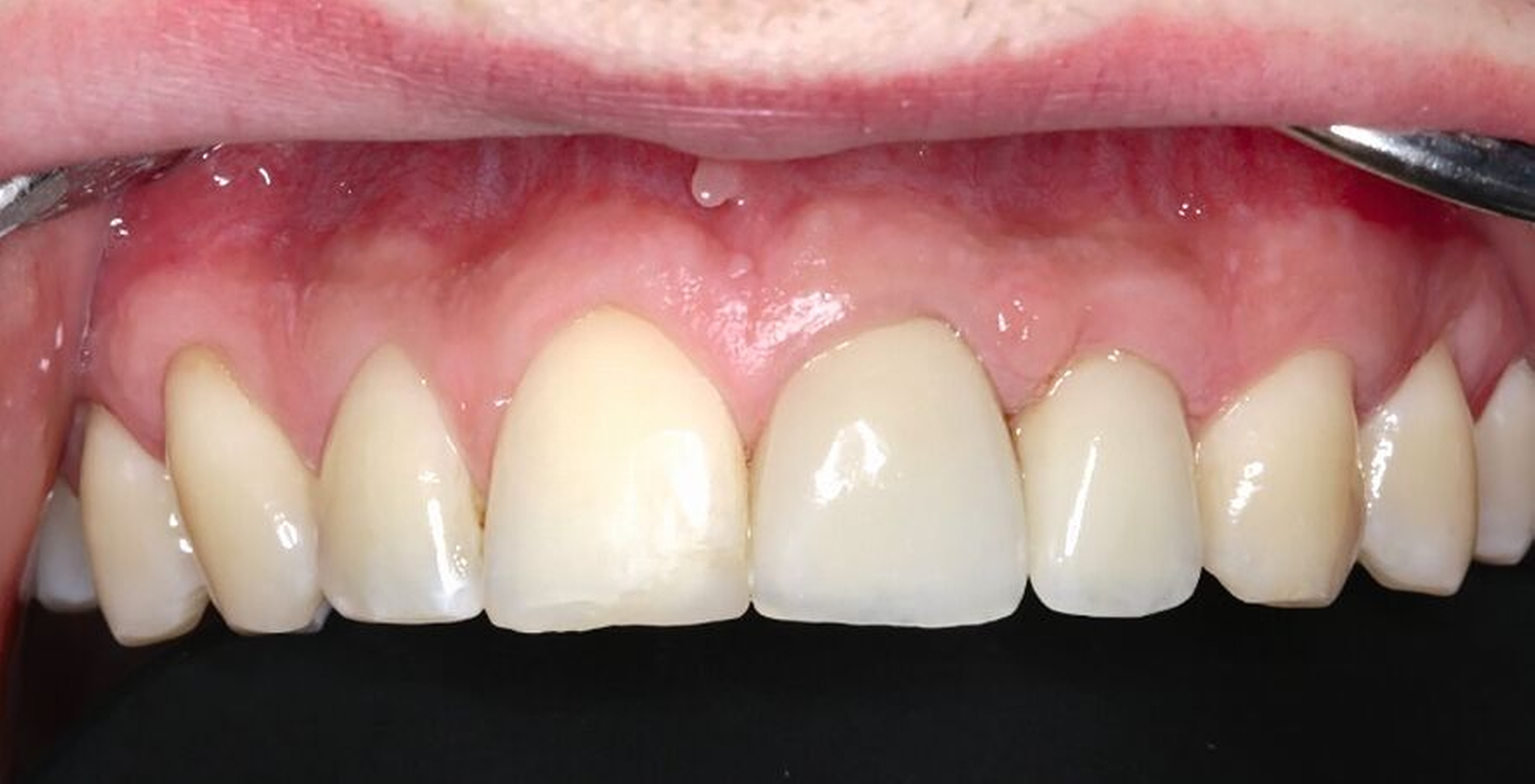 So konnten beide Lithiumdisilikat-Keramikkronen im Labor verblockt hergestellt werden, um einer unerwünschten Re-Intrusion vorzubeugen. Abbildung 26 zeigt die Situation zur Aufnahme der prothetischen Versorgung. In Abbildung 27 ist die Situation nach Einsetzen mit adhäsivem Befestigungskomposit zu sehen. Bei der Kontrolle ein Jahr nach Einsetzen der Versorgung zeigt sich klinisch der Therapieerfolg (Abbildung 28).