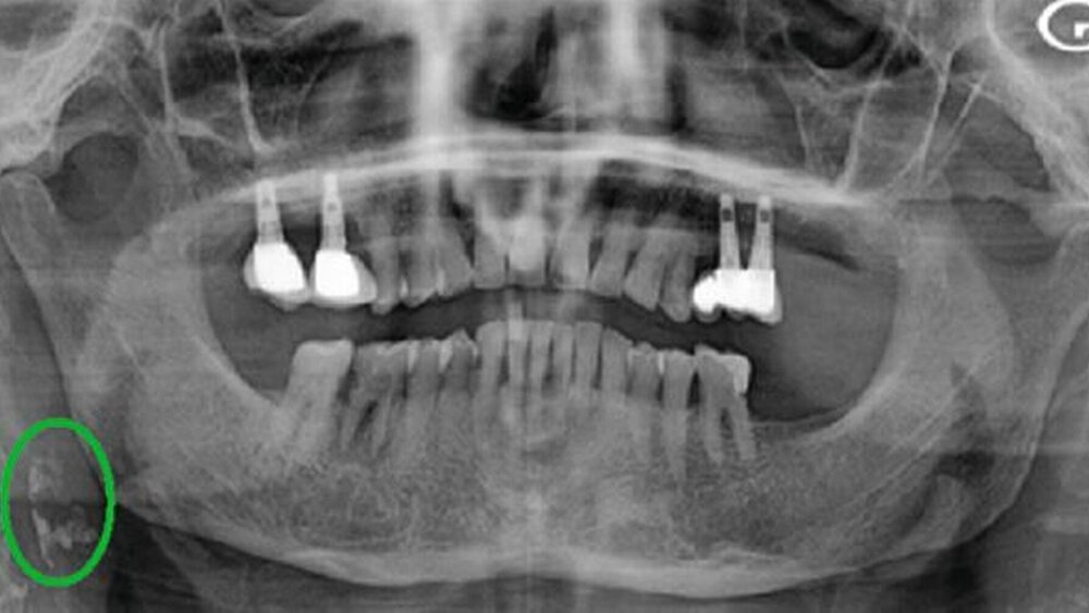 Die Autorinnen und Autoren berichten über eine 70-jährige Patientin, die sich mit dem Wunsch eines Implantats bei ihrem Zahnarzt vorstellte. Sie befand sich bereits aufgrund einer bekannten Hypertonie in kardiologischer Behandlung. Im Rahmen der Implantat-Planung wurde eine Panoramaschichtaufnahme angefertigt und „auf der Ebene der rechten laterozervikalen Region wurden mehrere verschmelzende, heterogene, röntgendichte Bilder von Kalkablagerungen mit unregelmäßigen Grenzen entdeckt, die auf der Ebene der prävertebralen Weichteile zwischen dem zweiten und dem dritten Halswirbel (C2 und C3), hinter dem Unterkieferwinkel, neben dem Zungenbein, hervorstehen und sich vertikal über etwa 16 mm erstrecken“ (Abbildung 1) [Zaghden et al., 2023]. Die Patientin wurde daraufhin erneut bei ihrem Kardiologen vorstellig. Die Doppler-Ultraschall-Untersuchung bestätigte den Verdacht einer atheromatös-kalkhaltigen Infiltration der Arteria carotis interna, aber es war zunächst keine chirurgische Intervention notwendig. Die Patientin wurde medikamentös eingestellt und engmaschig kontrolliert.