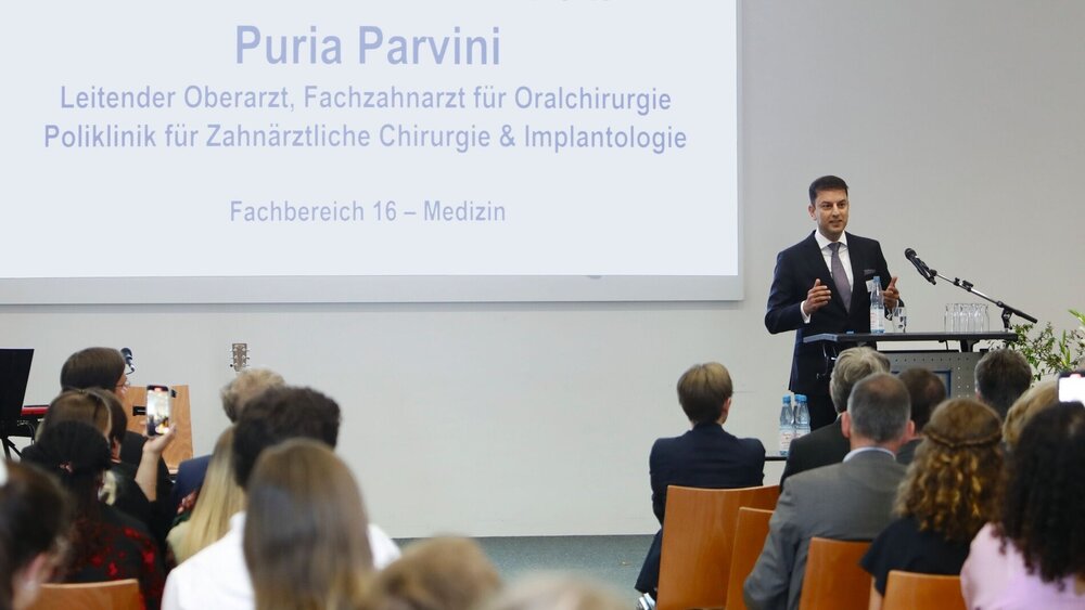 Zum 22. Mal wurde an der Goethe-Universität in Frankfurt der 1822-Universitätspreis für exzellente Lehre verliehen. Den mit 15.000 Euro dotierten 1. Preis erhielt PD Dr. Puria Parvini, M.Sc. M.Sc., der als Leitender Oberarzt an der Poliklinik für Zahnärztliche Chirurgie der Goethe-Universität tätig ist. In ihrem Nominierungsschreiben heben die Studierenden hervor, dass Parvini sich sehr dafür einsetzt, den zahnmedizinischen Nachwuchs auf den aktuellen wissenschaftlichen Stand zu bringen. Sie beschrieben ihn als „außergewöhnliche Person“. Er begegne den Studierenden auf Augenhöhe, nehme sich für alle Fragen Zeit, lasse den Nachwuchs an seiner Forschung teilhaben. Mithilfe einer ausführlichen Dokumentation seiner Patientenfälle fülle er den theoretischen Inhalt seiner Vorlesungen mit Leben. Er ermögliche den Studierenden zum Teil auch eine aktive Teilnahme an Operationen. „Dr. Parvini ist ein Vorbild, nicht nur als Zahnarzt, sondern auch als Mensch“, schloss die Laudatio.