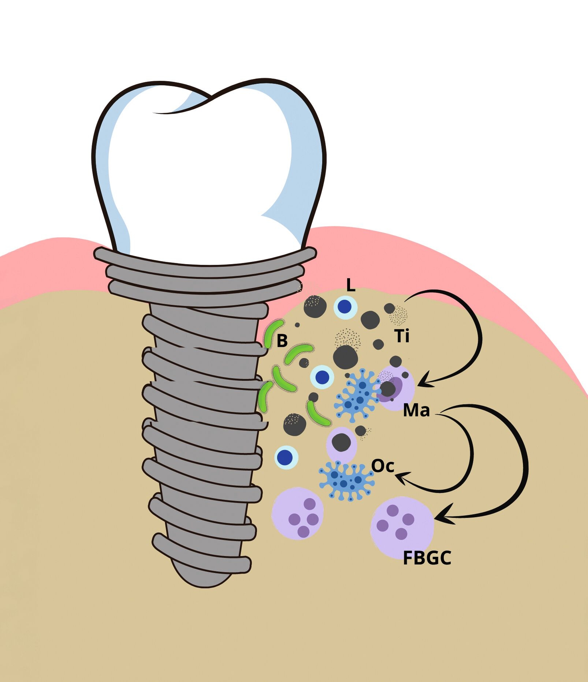 Die Intensität einer proinflammatorischen Reaktion hängt höchstwahrscheinlich von individuellen Veranlagungen beziehungsweise der Stärke der inflammatorischen Immunantwort des Körpers ab. Hierbei können auch genetische Faktoren eine Rolle spielen [Summer et al., 2022]. Sobald eine proinflammatorische Kaskade abläuft, kann diese zum Zusammenbruch des „foreign body equilibrium“, also des Gleichgewichts zwischen Implantat und Gewebereaktion auf das Implantat, führen. Die aktivierten Makrophagen aktivieren Osteoklasten oder fusionieren zu mehrkernigen Riesenzellen, die Knochenmineralstrukturen auflösen können [ten Harkel et al., 2015]. Der Pathomechanismus der Inflammasom-Aktivierung in Makrophagen durch Lipoproteine parodontaler Pathogene sowie durch Titanpartikel wurde in der Literatur bereits beschrieben. Es konnte gezeigt werden, dass sowohl die LPS parodontopathogener Keime als auch Titanpartikel über die gleichen Toll-like-Rezeptoren die Entzündungskaskade im Makrophagen aktivieren. Beide Trigger wirken synergistisch und verstärken die Produktion des proentzündlichen Zytokins IL-1b im Inflammasom und damit die Entzündungsreaktion [Pettersson et al, 2016], jedoch gibt es bisher keine Belege für die Beteiligung spezifischer Lymphozyten [Maloney et al., 1993; Kumazawa et al., 2002].