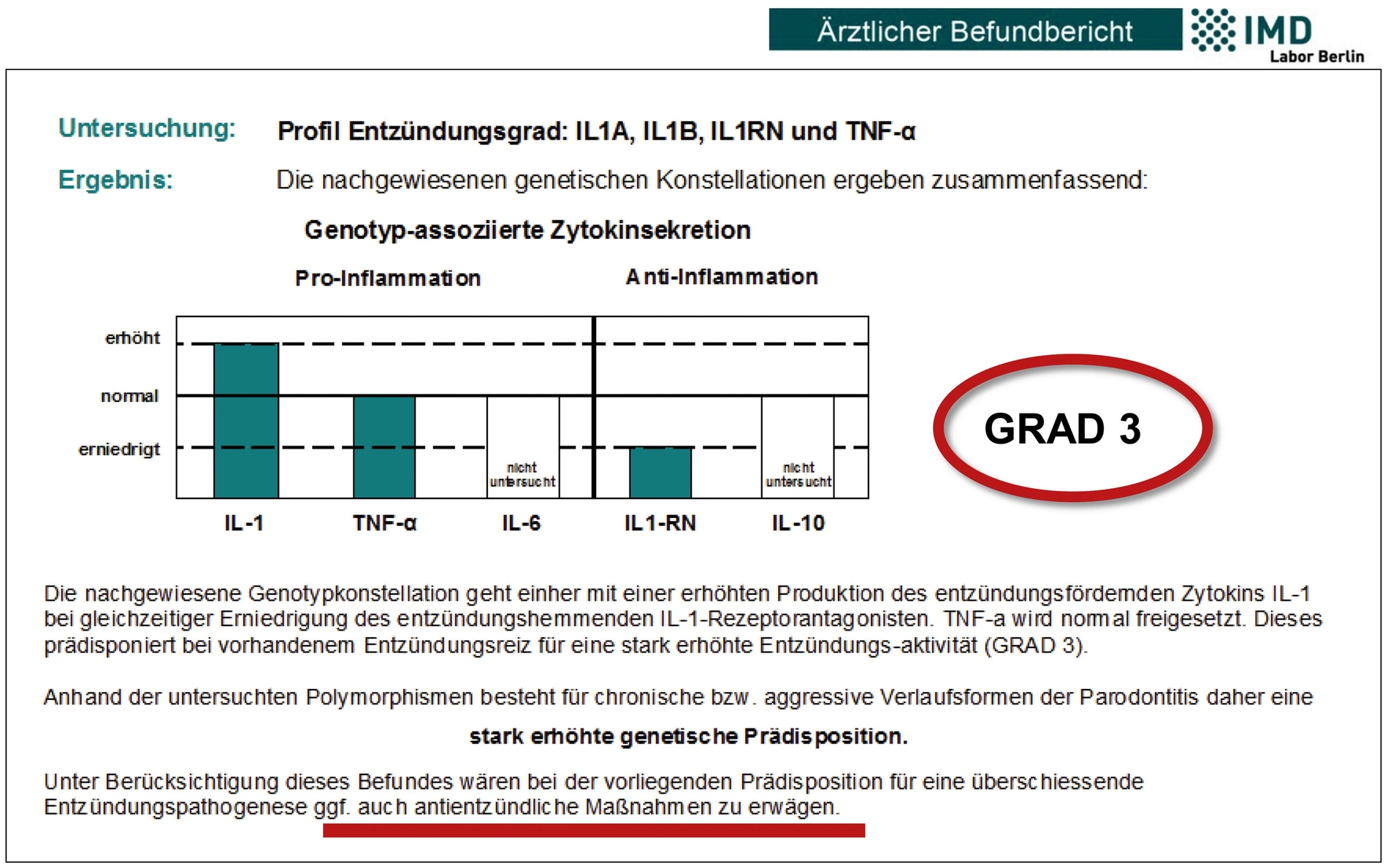 Die enge Assoziation von genetischen Varianten zum Schweregrad der Entzündung wurde für die Parodontitis/Periimplantitis durch eine Vielzahl von Studien belegt [Deng et al., 2013; Mao et al., 2013; Ding et al., 2012; Ding et al., 2014]. Dabei ist zu beachten, dass Assoziationen zwar belegt sind, eine Kausalität aber nicht ohne Weiteres abzuleiten ist.