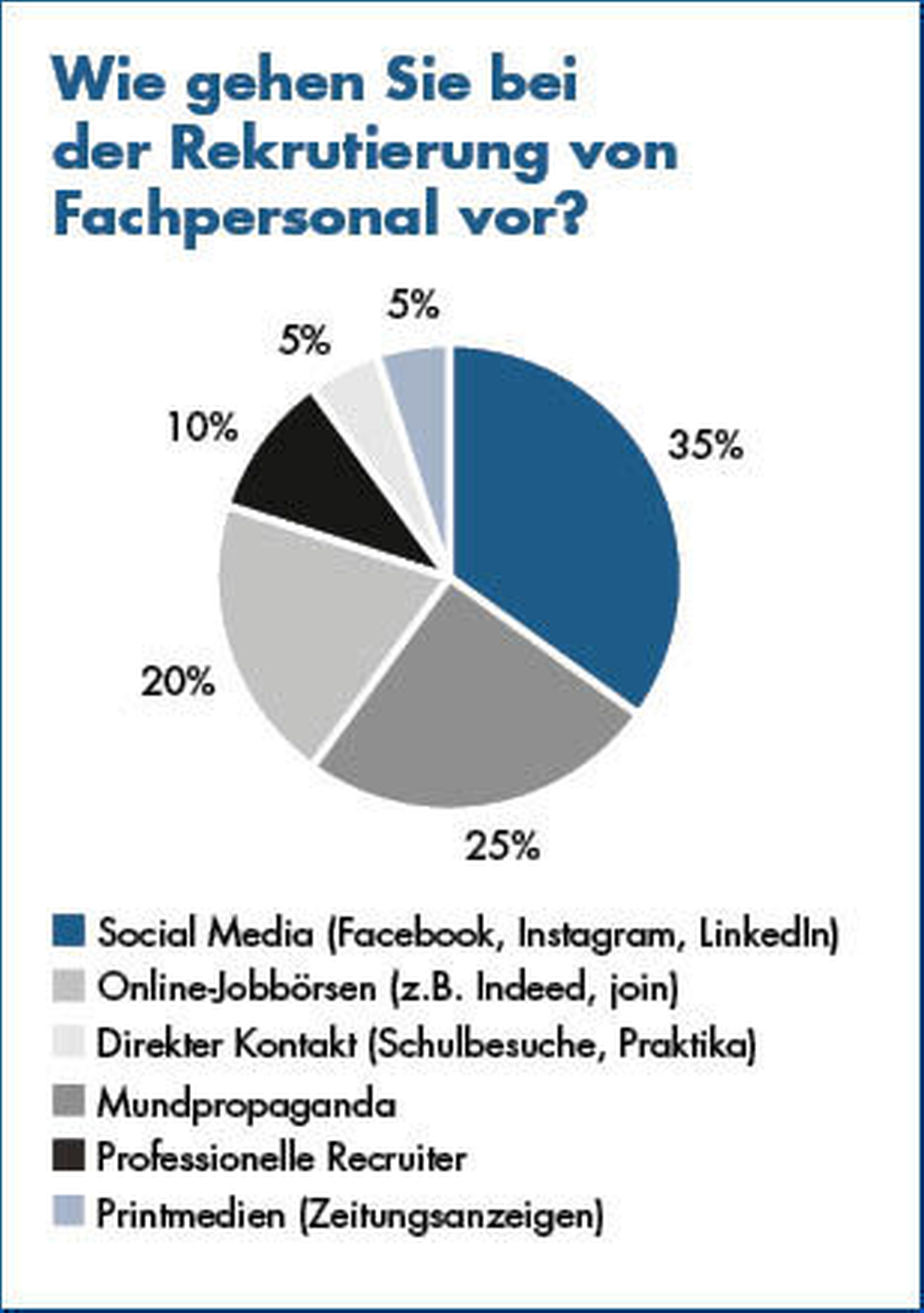 35 Prozent der Praxen nutzen Social Media wie Facebook und Instagram für ihre Rekrutierungsmaßnahmen, während 20 Prozent auf Online-Jobbörsen zurückgreifen. Trotz der Digitalisierung bleibt Mundpropaganda mit 25 Prozent ein bewährter Weg zur Personalgewinnung. Einige Praxen, etwa 10 Prozent, setzen zudem auf professionelle Recruiter oder suchen den direkten Kontakt zu potenziellen Bewerbern durch Schulbesuche und Praktika. Printmedien werden noch von 5 Prozent der Befragten für Stellenanzeigen genutzt.