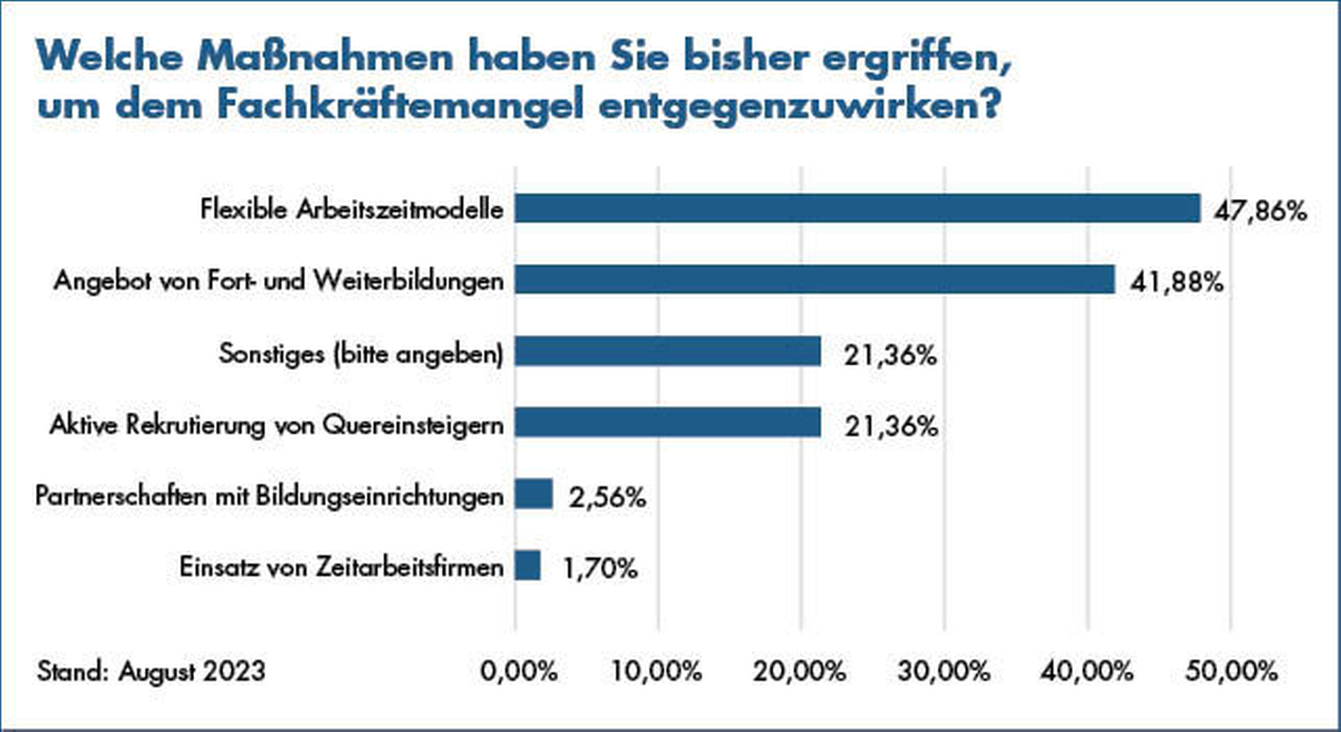 Bemerkenswert ist, dass viele Praxen nicht über die Vielzahl an Unterstützungsangeboten informiert sind, die ihnen zur Verfügung stehen könnten. Abseits der in der Umfrage genannten Angebote gibt es in einigen Bundesländern Bildungsgutscheine, die zur Weiterbildung des Personals genutzt werden können. Auch andere staatliche Förderungen, wie das Aufstiegs-BAFÖG oder die Bildungsprämie, könnten für Praxen interessant sein. Darüber hinaus bieten AZAV-geförderte Maßnahmen Möglichkeiten zur Qualifizierung von Personal.