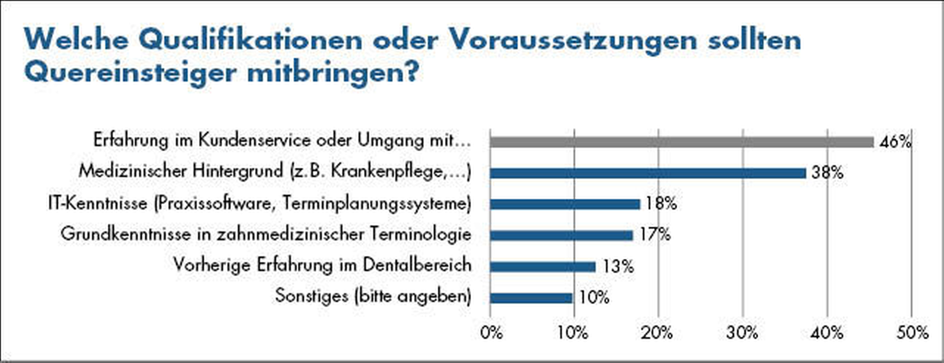 Die Umfrage der OPTI health consulting GmbH unter mehr als 130 Praxisinhaberinnen und Praxisinhabern im August 2023 gibt Aufschluss darüber, wie Quereinsteiger in der Dentalbranche wahrgenommen werden und welche Rolle sie in der Zukunft spielen könn(t)en. Ausgehend von den Praxen, deren Teams bereits durch Quereinsteiger verstärkt werden, und den nachgefragten Qualifikationen haben wir zuerst das Anforderungsprofil ermittelt.