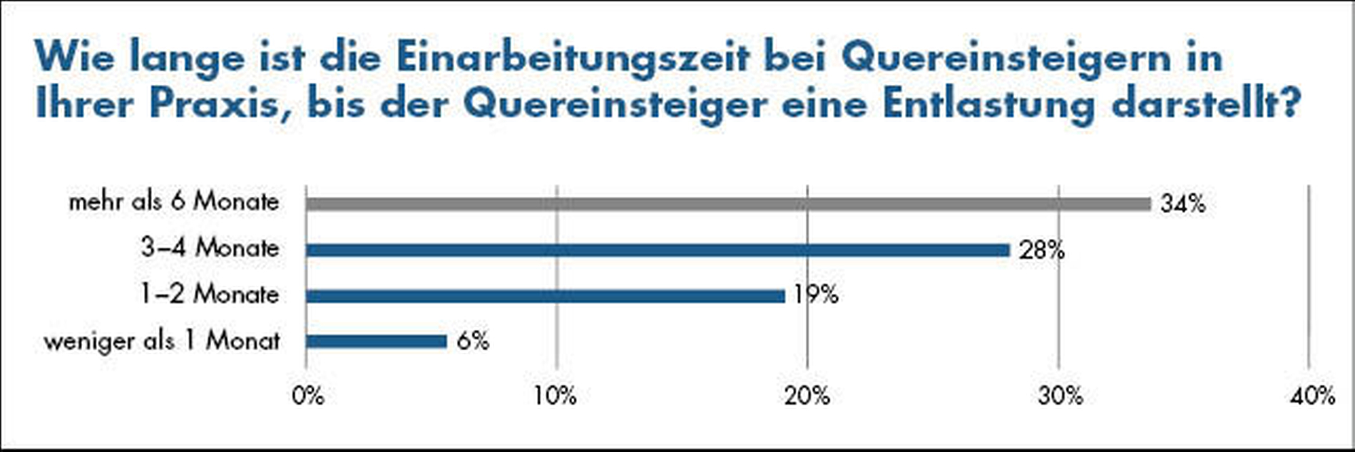 Während traditionell ausgebildetes Personal oft schneller in den Praxisalltag integriert werden kann, benötigen Quereinsteiger eine intensivere Einarbeitung. Laut unserer aktuellen Umfrage geben mehr als ein Drittel der Praxisinhaber (33,70 Prozent) an, dass für diese Gruppe eine Einarbeitungszeit von über sechs Monaten notwendig ist (Abbildung 4). Weitere 28,08 Prozent der Befragten berichten von einer Einarbeitungsphase von drei bis vier Monaten, während 19,1 Prozent eine Zeitspanne von ein bis zwei Monaten angeben. Dies unterstreicht die Notwendigkeit, sowohl den Quereinsteigern als auch den Praxisteams ausreichend Zeit und Ressourcen für eine erfolgreiche Integration zur Verfügung zu stellen.