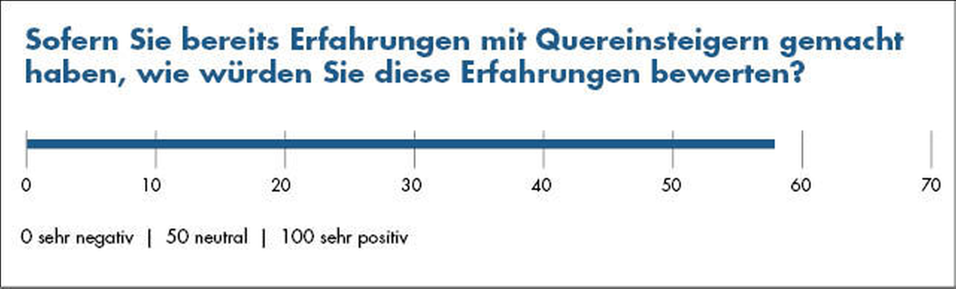 Mehr als die Hälfte (56,52 Prozent) der befragten Praxisinhaberinnen und -inhaber hat bereits Erfahrungen mit Quereinsteigern gemacht (Abbildung 1). Deren Erfahrungen sind überwiegend positiv, mit einem durchschnittlichen Bewertungswert von 57,929 (Abbildung 2). Dies zeigt, dass Quereinsteiger, wenn sie richtig eingearbeitet werden, eine wertvolle Ergänzung für das Team sein können.