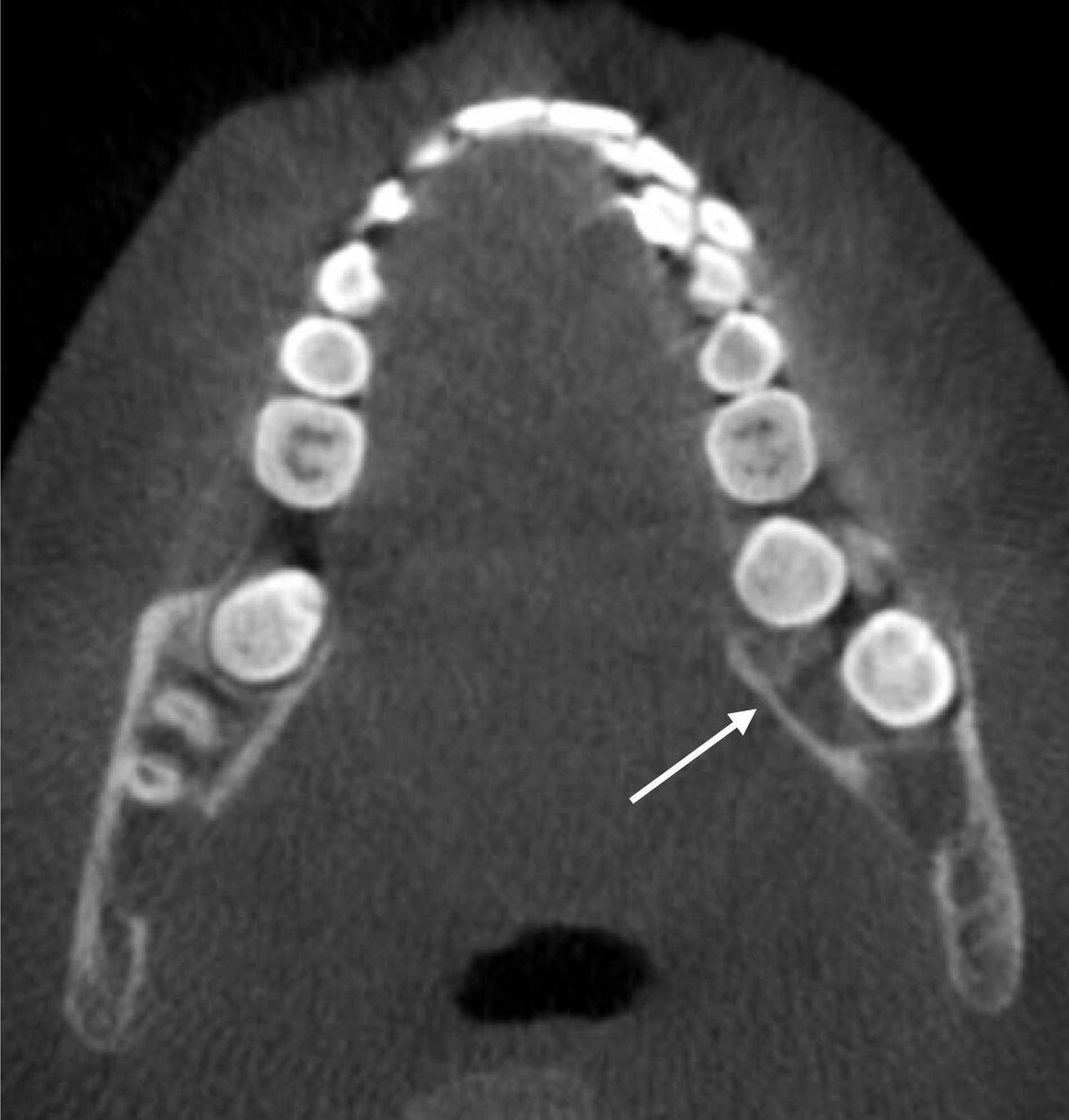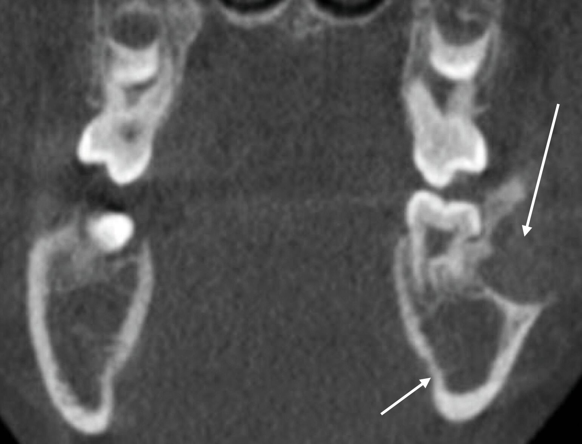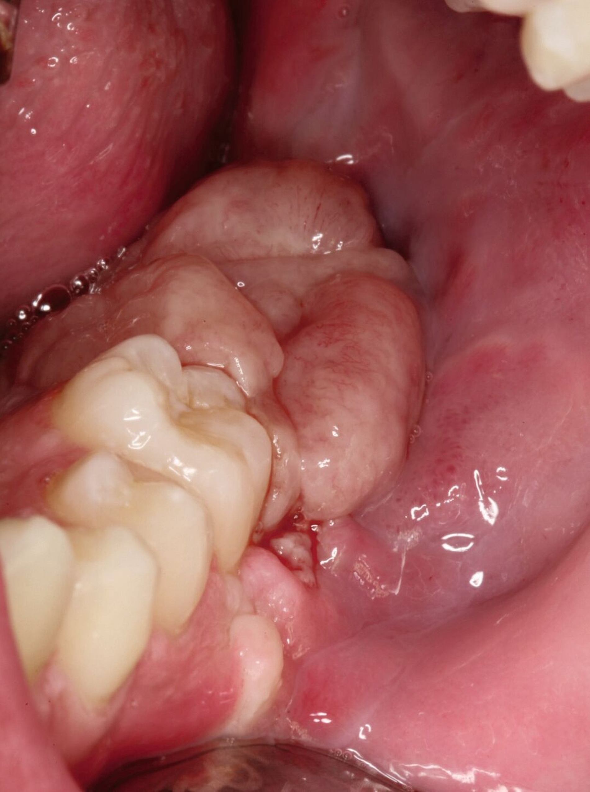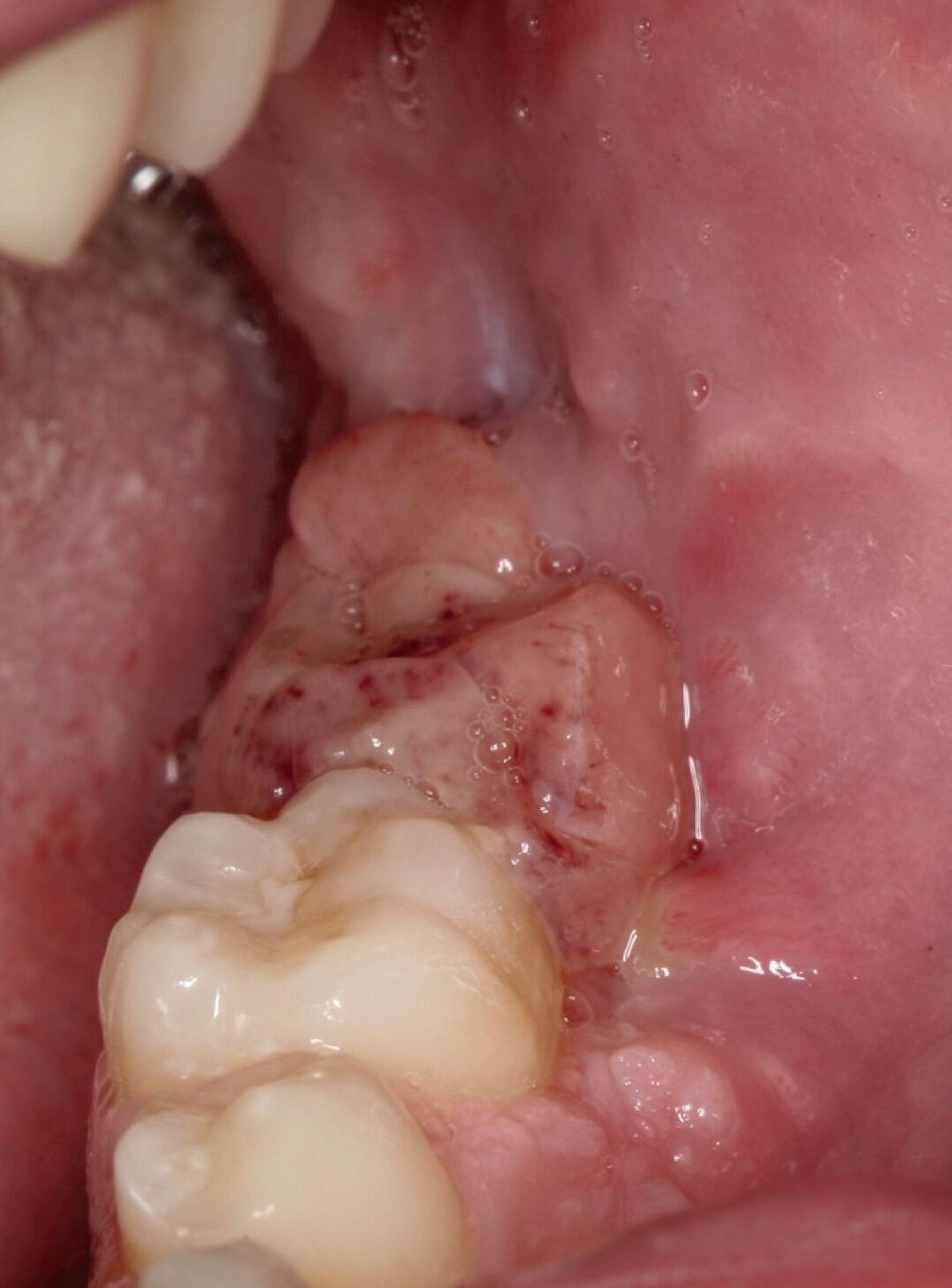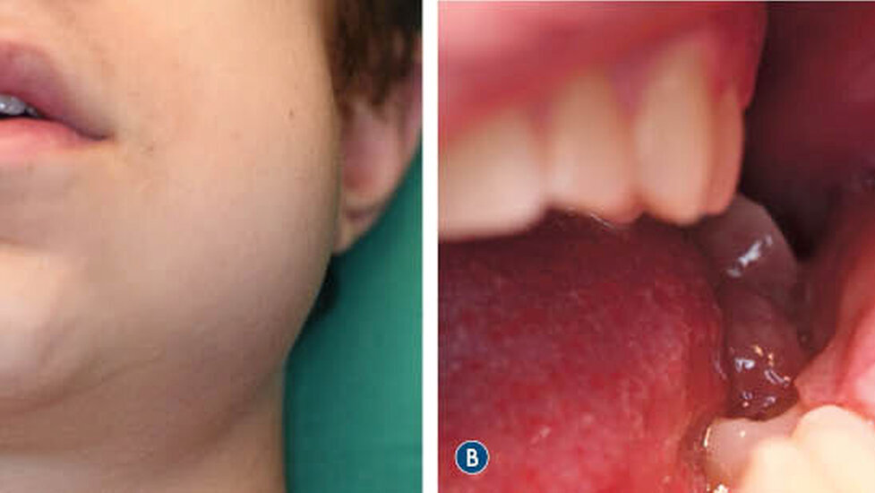 Ein 16-jähriger Junge stellte sich nach Überweisung durch seine behandelnde Kieferorthopädin aufgrund einer progredienten Schwellung des linken Unterkiefers in der Klinik und Poliklinik für Mund-, Kiefer- und Gesichtschirurgie vor. In der klinischen Untersuchung zeigte sich ein prominenter Befund distal der Zahnreihe mit hyperplastisch wirkender Schleimhaut (Abbildung 1).