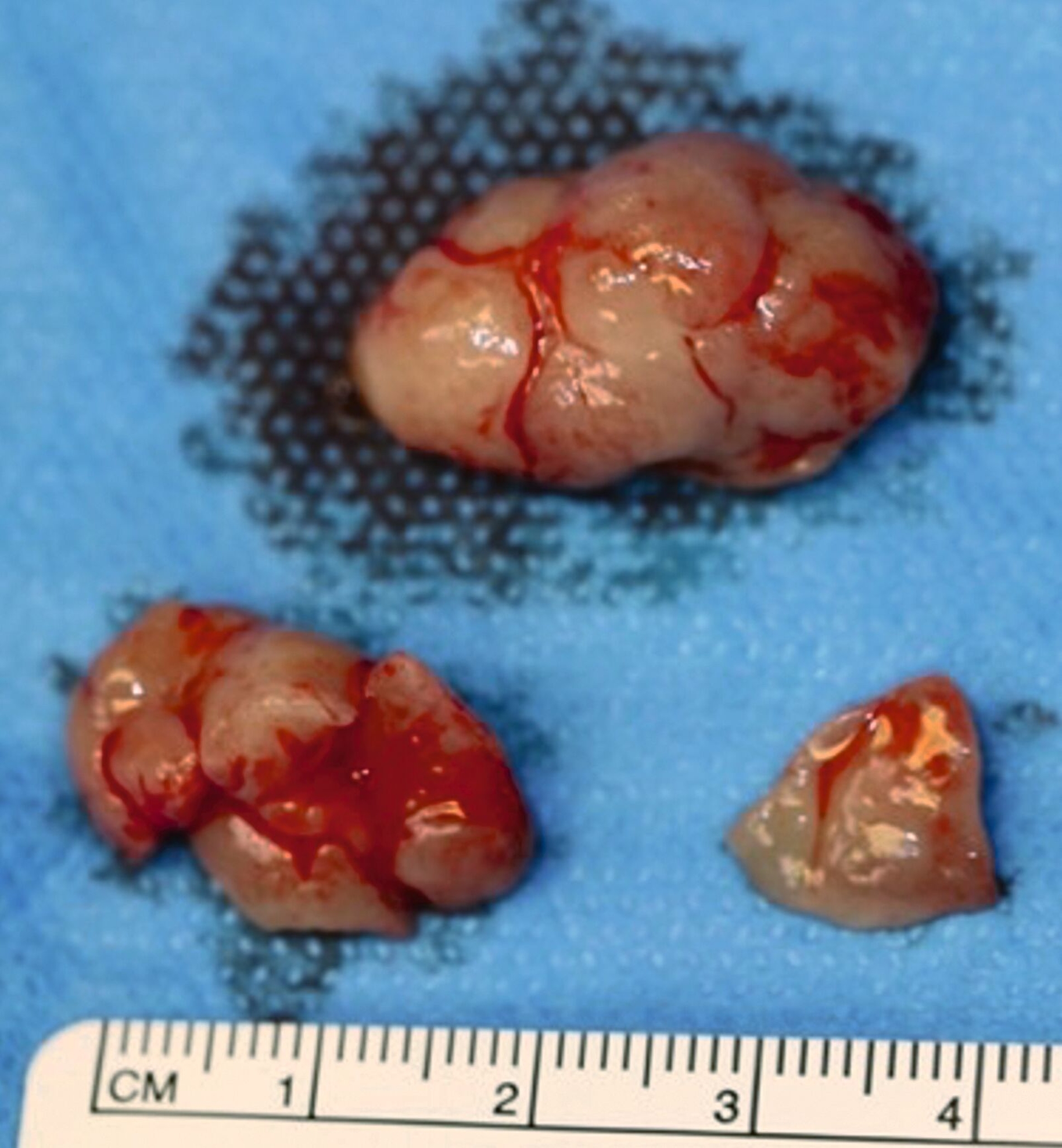 Bei Verdacht auf das Vorliegen einer Keratozyste und zum Ausschluss eines Malignoms wurde die chirurgische Entfernung der Befunde in Intubationsnarkose durchgeführt. Hierbei erfolgte die Zystektomie beider Raumforderungen gemeinsam mit der Osteotomie der Zähne 37, 38, 47 und 48. Insbesondere in regio 38 zeigte der Befund eine direkte Kontinuität zwischen Knochen und Weichgewebe. Das Resektat wies eine gelbliche Farbe und eher weiche Konsistenz auf (Abbildung 4).