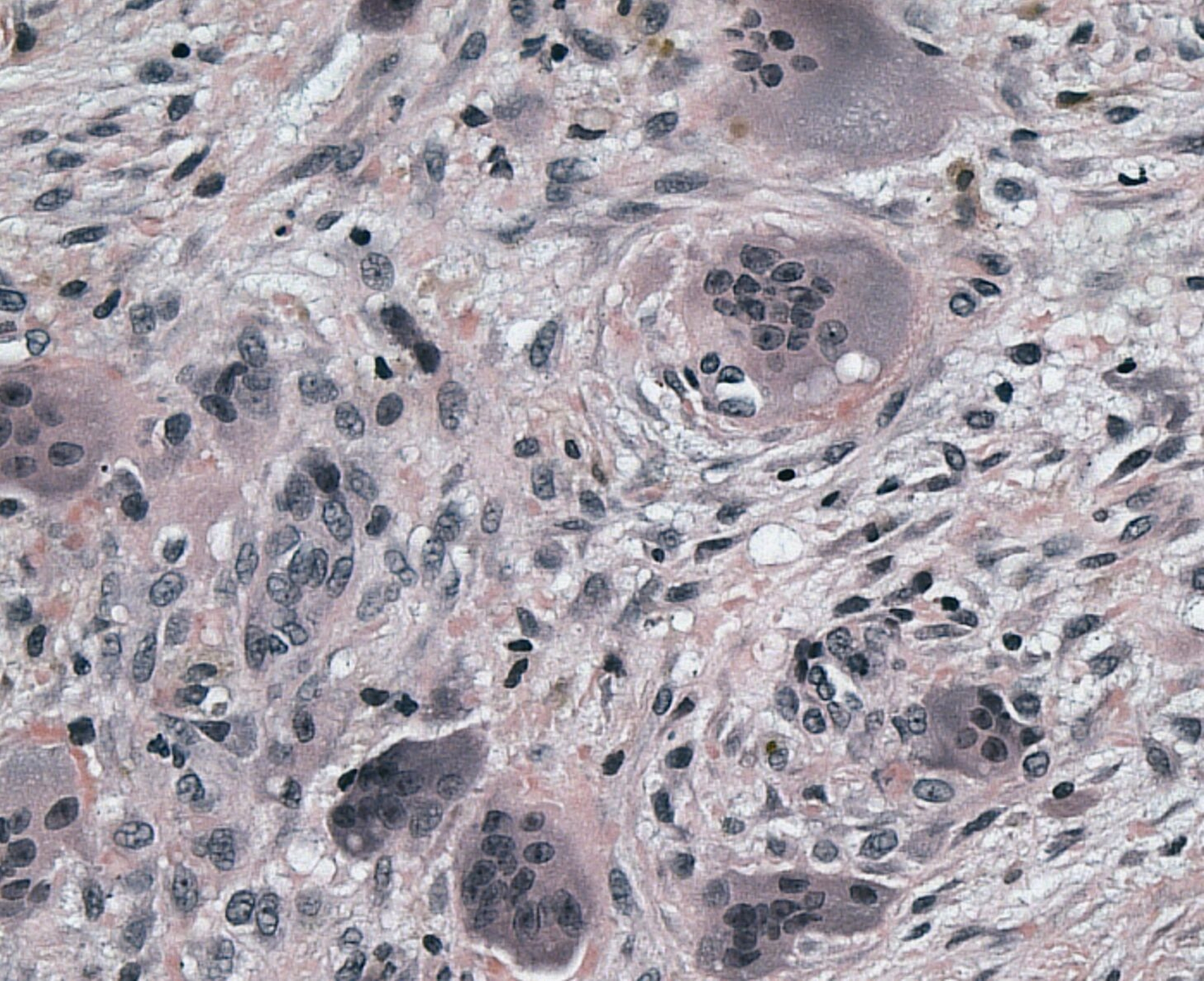 In Anbetracht der doch beträchtlichen Größe der Wundhöhle wurde diese anschließend mit Beckenkammspongiosa aufgefüllt. In der anschließenden histopathologischen Aufarbeitung kam eine fragmentierte spindelzellige und riesenzellhaltige Läsion des Weichgewebes mit lokal den Knochen destruierendem Wachstumsverhalten zur Darstellung. Zudem zeigte der Befund starke Entzündungszeichen, was die differenzialdiagnostische Beurteilung deutlich erschwerte. Zur Klärung der Dignität des Befunds wurde dieser zur referenzpathologischen Mitbeurteilung versandt. Auch in dieser wurde ein polypoides, teils plattenepithelial überkleidetes Exzidat mit ausgedehnter Ulzeration sowie einem kapillarreichen Granulationsgewebe mit diffus verteilten Riesenzellen beschrieben (Abbildung 5). In beiden pathologischen Berichten wurde die Raumforderung als primär mit einem Riesenzellgranulom vereinbar erachtet.