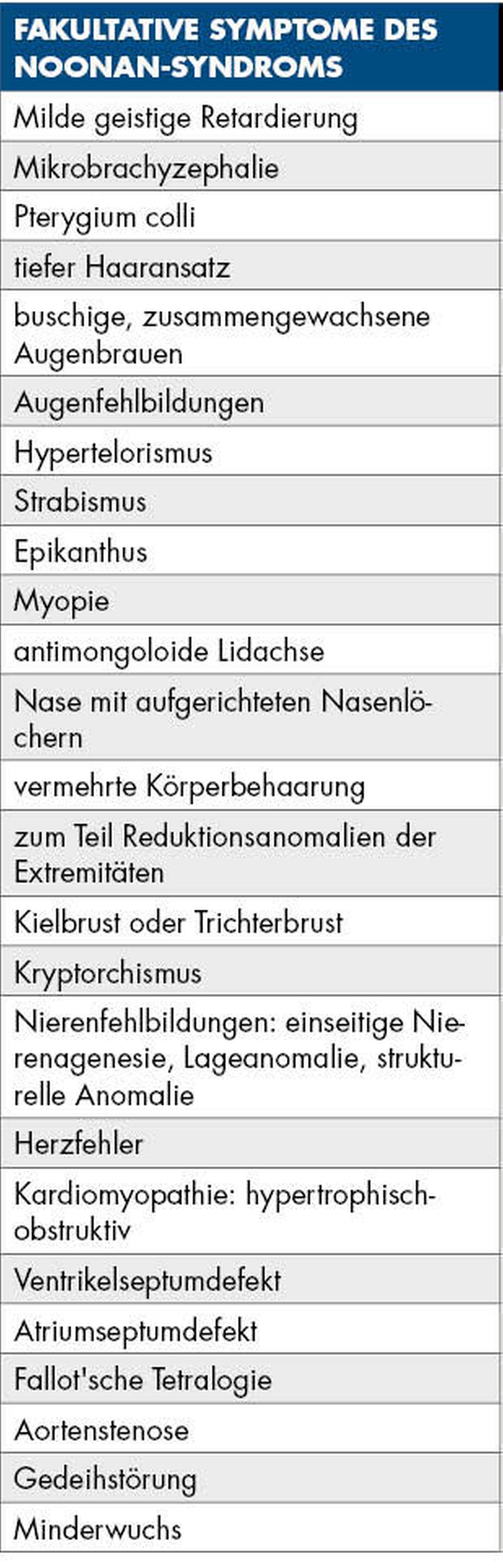 Beim Noonan-Syndrom handelt es sich um einen Fehlbildungskomplex, der in seinem Erscheinungsbild dem Ulrich-Turner-Syndrom ähnlich ist. Mit einer Inzidenz von 1:1.000 Geburten ist das Noonan-Syndrom eines der häufigsten genetischen Syndrome und die zweithäufigste Ursache für angeborene Herzstörungen [Roberts et al., 2013]. Es handelt sich um eine meist autosomal-dominante Anomalie des RAS-MAPK-Signalwegs. Dieser bildet eine zentrale Schnittstelle, über die extrazelluläre Liganden wie Wachstumshormone und Zytokine die Zellproliferation, -differenzierung, und den Zellmetabolismus steuern [Roberts et al., 2013]. Typische Symptome sind – wie im beschriebenen Fall – Hypertelorismus und Ptosis sowie große und tiefsitzende Ohren. Patienten mit einem Noonan-Syndrom weisen häufig einen Kleinwuchs und eine Pulmonalstenose auf. Weitere Symptome, die in ihrer Häufigkeit variieren und nur fakultativ auftreten, sind in Tabelle 1 zusammengefasst [van der Burgt, 2007].