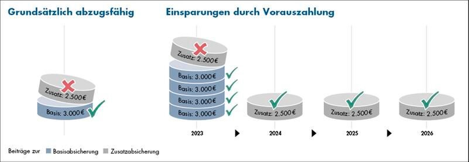 Zahlt beispielsweise ein lediger Zahnarzt jährlich 3.000 Euro zur Basiskranken- und Pflegeversicherung und 2.500 Euro für seine Zusatzabsicherung, sind nur 3.000 Euro steuerlich abzugsfähig, weil dadurch der Höchstbetrag von 2.800 Euro bereits ausgeschöpft ist. Durch eine Vorauszahlung von Basiskranken- und Pflegeversicherungsbeiträgen (maximal drei Jahresbeiträge) kann die steuerliche Abzugsfähigkeit optimiert werden. Werden 2023 für die Jahre 2024 bis 2026 die Beiträge zur Basisabsicherung vorausgezahlt, sind in 2023 insgesamt 4 x 3.000 Euro = 12.000 Euro abzugsfähig (Abbildung 1).