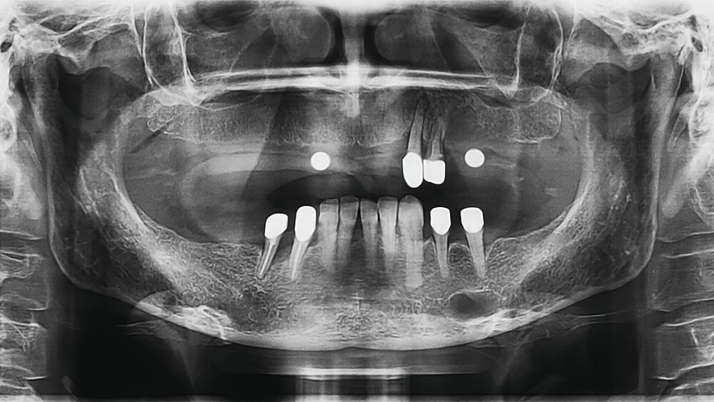 Die Patientin zeigte keine Hypästhesien in den Bereichen der Nervenaustrittspunkte. Die Zähne 42 bis 35 waren vital. Die Zähne 23, 24 und 44 sollten präimplantologisch extrahiert werden. Im Zuge der Implantatplanung wurde eine Panoramaschichtaufnahme (PSA) mit Messkugeln angefertigt (Abbildung 1).