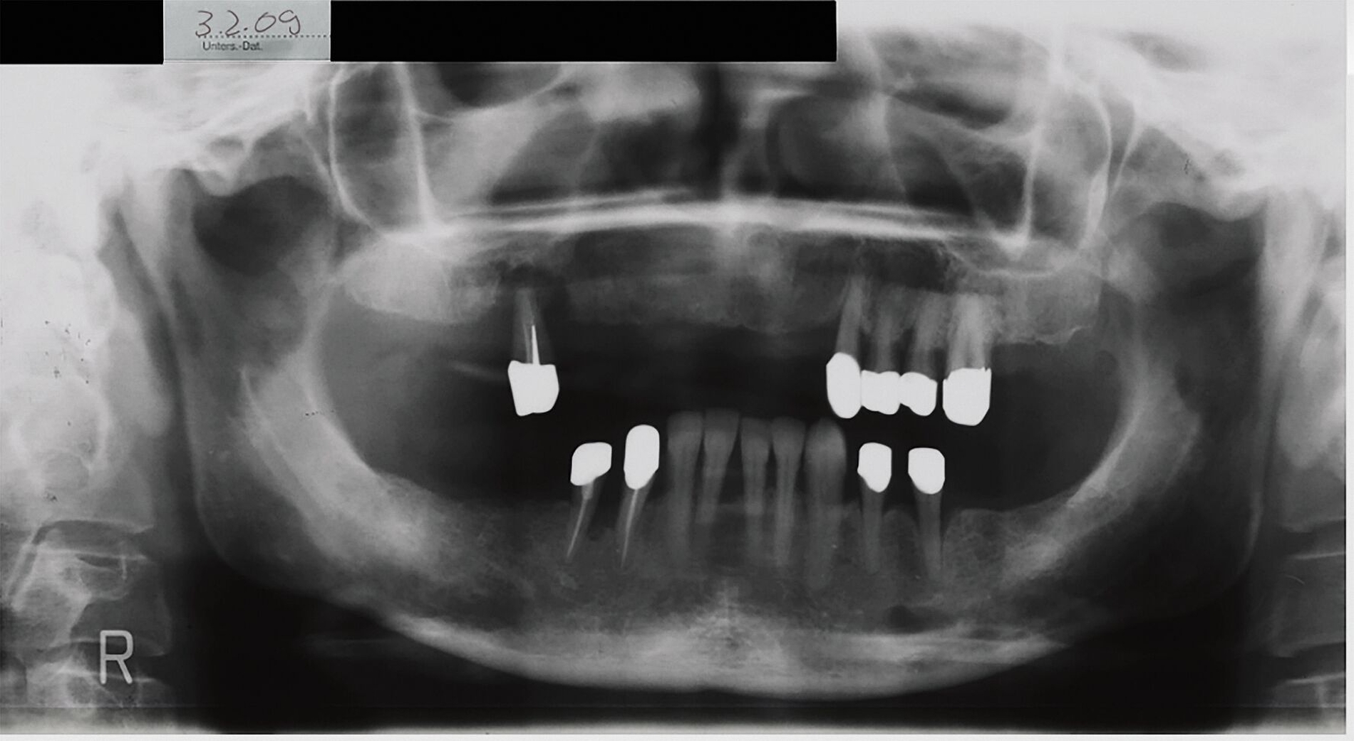 Eine 57-jährige Frau, die von ihrem Hauszahnarzt überwiesen wurde, stellte sich in unserer oralchirurgischen Überweiserpraxis zur Beratung bezüglich einer implantologischen Versorgung des Oberkiefers vor. Die Allgemeinanamnese war bis auf eine bekannte Hypothyreose und die begleitende Dauermedikation mit Euthyrox unauffällig. Spezialanamnestisch zeigten sich ein reduzierter Zahnbestand und eine ausgeprägte Parodontitis, die zu diesem Zeitpunkt parodontologisch behandelt wurde.