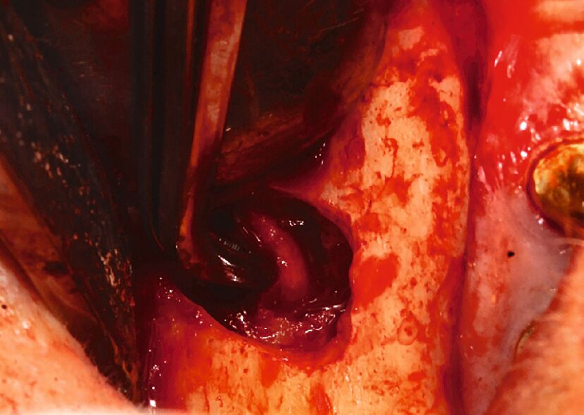 Abbildung 4 dokumentiert den klinischen Befund nach der Erweiterung des Foramen mentale. Es präsentierte sich eine weichgewebige, verstärkt blutende, filigraneRaumforderung, die sich um den Nervus alveolaris inferior herumzog. Unter dem OP-Mikroskop konnte die Raumforderung vom Nervus alveolaris inferior abpräpariert werden, so dass sich intraoperativ die Entscheidung zur vollständigen Entfernung des Befunds und zur Neurolyse des Nervus alveolaris inferior stellte.