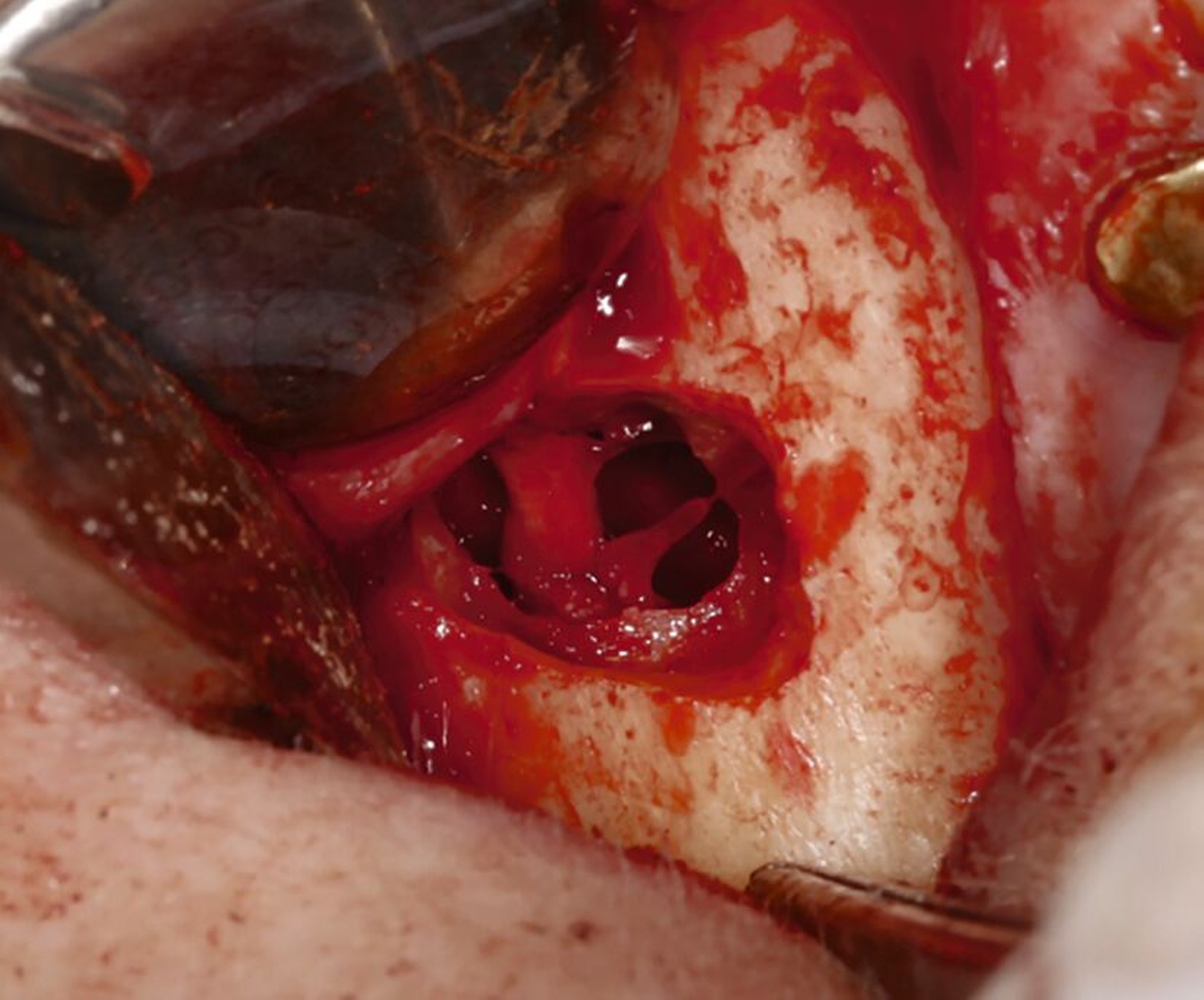 In Lokalanästhesie erfolgten nach paramarginaler Schnittführung Regio 33 bis 36 mit mesialer Entlastung die Bildung eines Mukoperiostlappens und die Darstellung des Foramen mentale. Unter Schonung des N. mentalis wurde das Foramen mentale nach distal durch Osteotomie mit rotierenden Instrumenten und Piezosurgery vorsichtig erweitert.