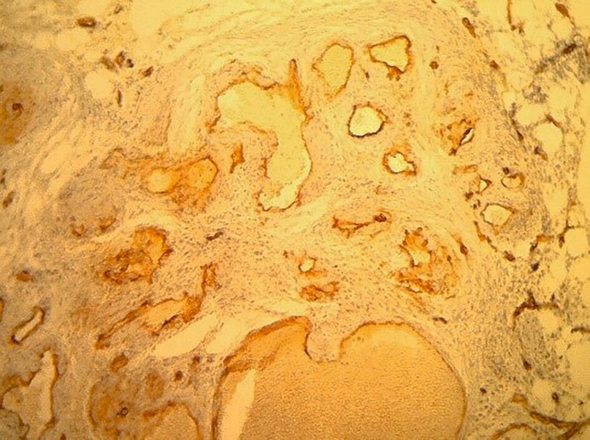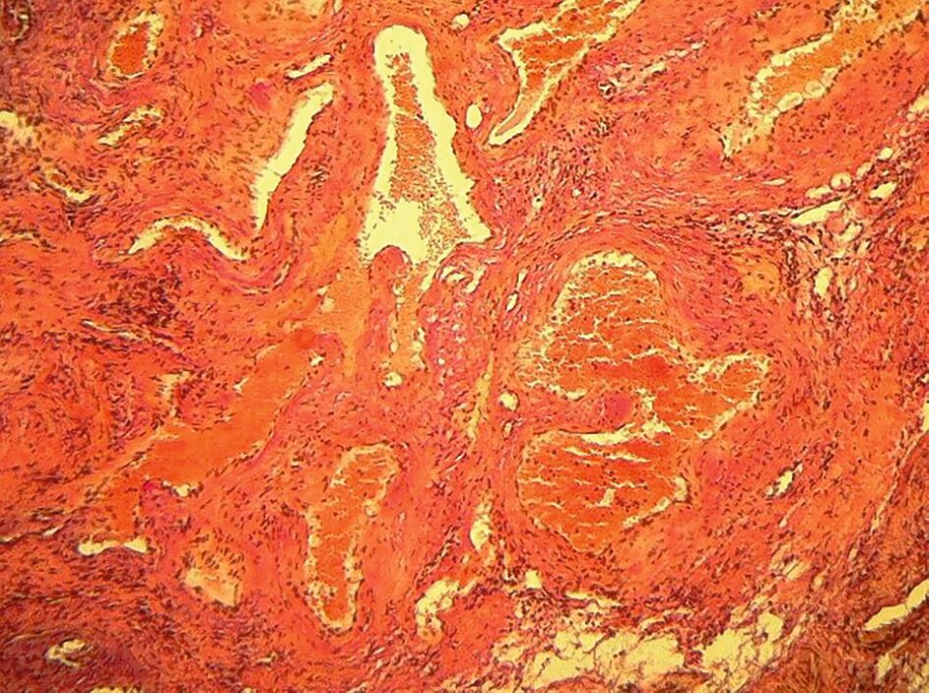 Die histopathologische Auswertung ergab in den Randbereichen der Läsion vereinzelte Makrophagen mit diskreter Siderin-Beladung. Die Aktin-Reaktion zeigte eine isomorphe Gefäßwanddicke mit teils plexusartigem, tumorähnlichem Aufbau und einer venösen Grundstruktur. Zum Ausschluss von Malignität wurde mit dem Proliferationsmarker Ki-67 die Zellproliferation geprüft, wobei sich kein Verdacht ergab.